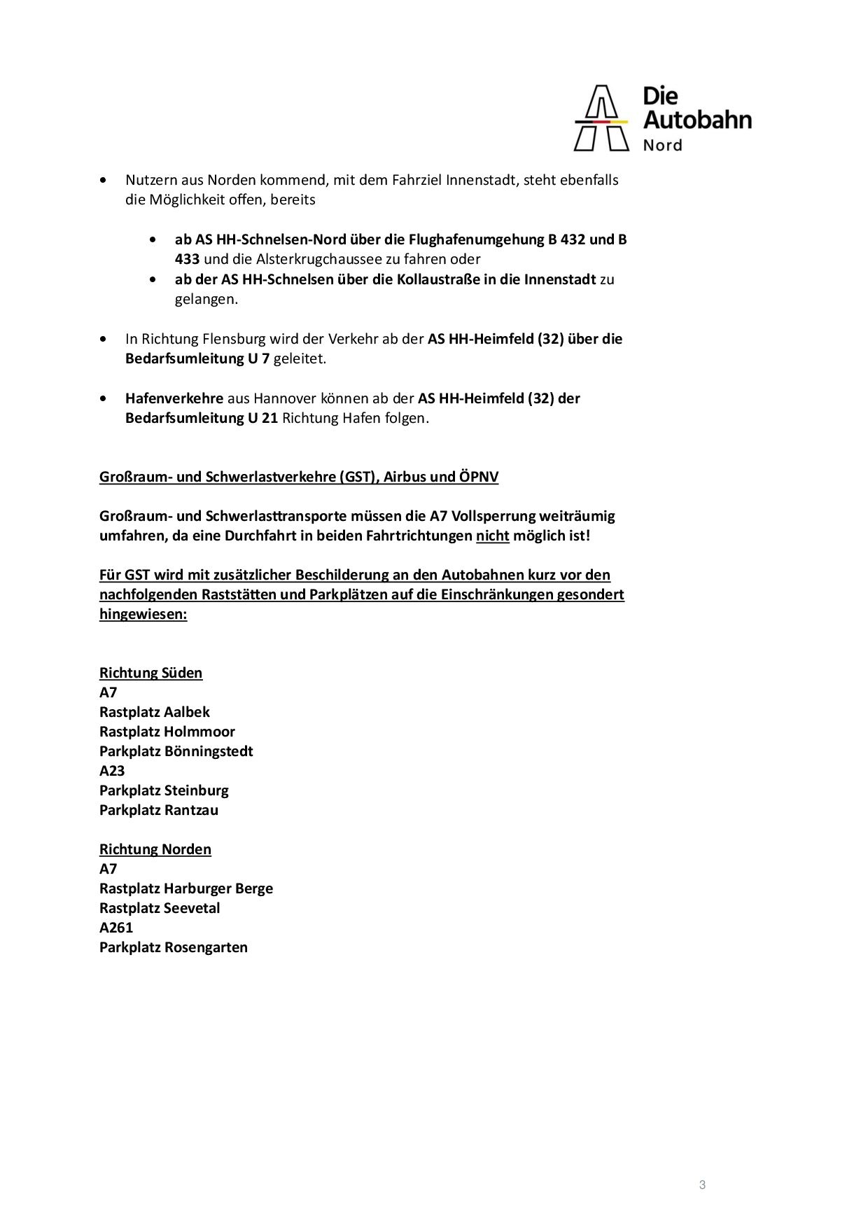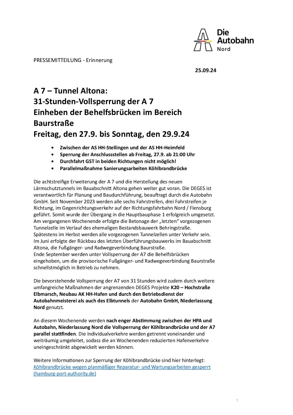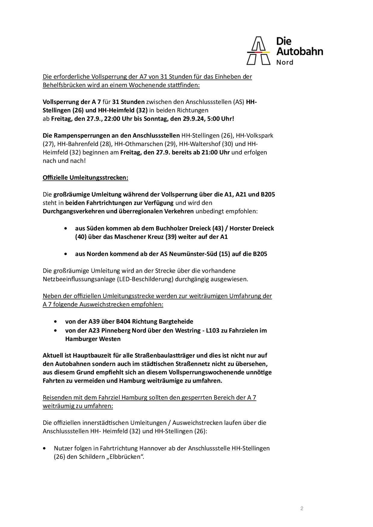 La empresa Die Autobahn GmbH des Bundes informa de un nuevo cierre total de la A7. Desde el viernes 27 de septiembre a las 22:00 horas hasta el domingo 29 de septiembre a las 5:00 horas, la A7 estará completamente cerrada entre los cruces HHStellingen (26) y HH-Heimfeld (32) en ambas direcciones.