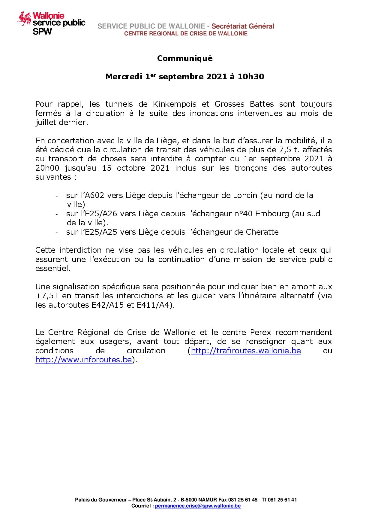 Tras las inundaciones en Bélgica, los túneles de Kinkempois y Grosses Battes siguen cerrados. En consecuencia, la ciudad de Lieja restringió la circulación de camiones (GVW> 7.5t) en tránsito desde el 1 de septiembre de 2021 a las 20:00h hasta el 15 de octubre de 2021. La prohibición se aplica solo a los vehículos en tránsito en las siguientes carreteras:
