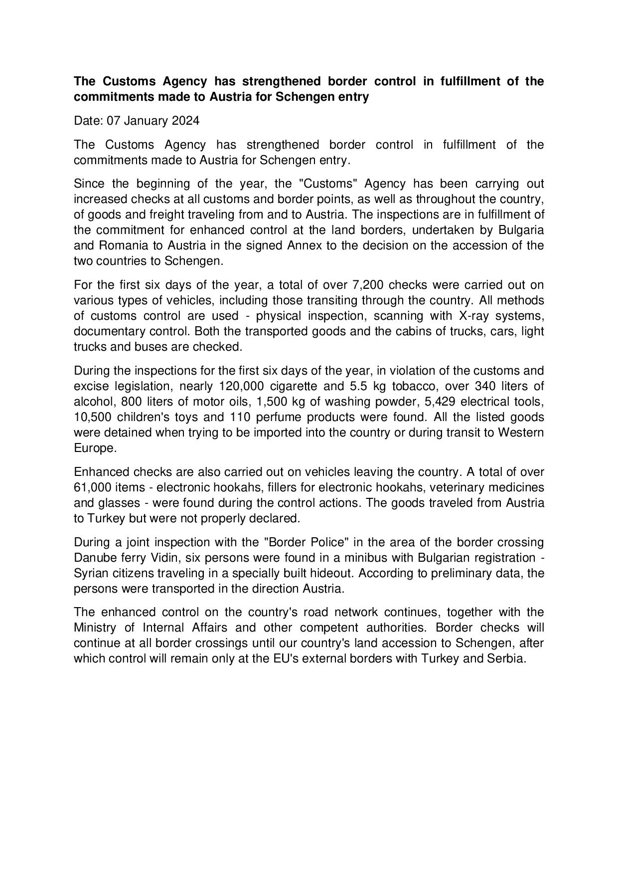Desde principios de 2024, la Agencia de Aduanas de Bulgaria, junto con otras autoridades competentes, ha estado intensificando los controles en todos los puntos aduaneros y fronterizos, así como en la red de carreteras del país, de las mercancías que viajan desde y hacia Austria.