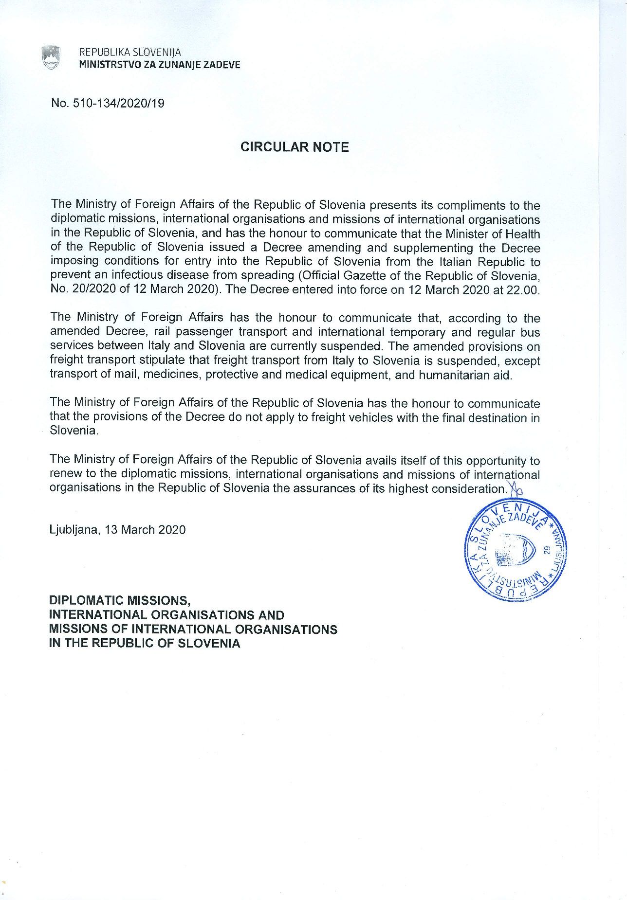 En el documento adjunto puede encontrar la resolución de las autoridades eslovenas con medidas similares a las que venimos informando, aunque se refiere específicamente a la entrada en su país de personas provenientes de Italia. Eslovenia ha suspendido el servicio de los trenes y autobuses provenientes de Italia. PERO TAMBIÉN HA SUSPENDIDO EL TRANSPORTE DE MERCANCÍAS DESDE ITALIA salvo correo, medicinas y material médico o de auxilio humanitario. Sin embargo, estipula que dicha prohibición NO APLICA EN LOS TRANSPORTES DE MERCANCÍA QUE TENGAN ESLOVENIA COMO DESTINO FINAL.