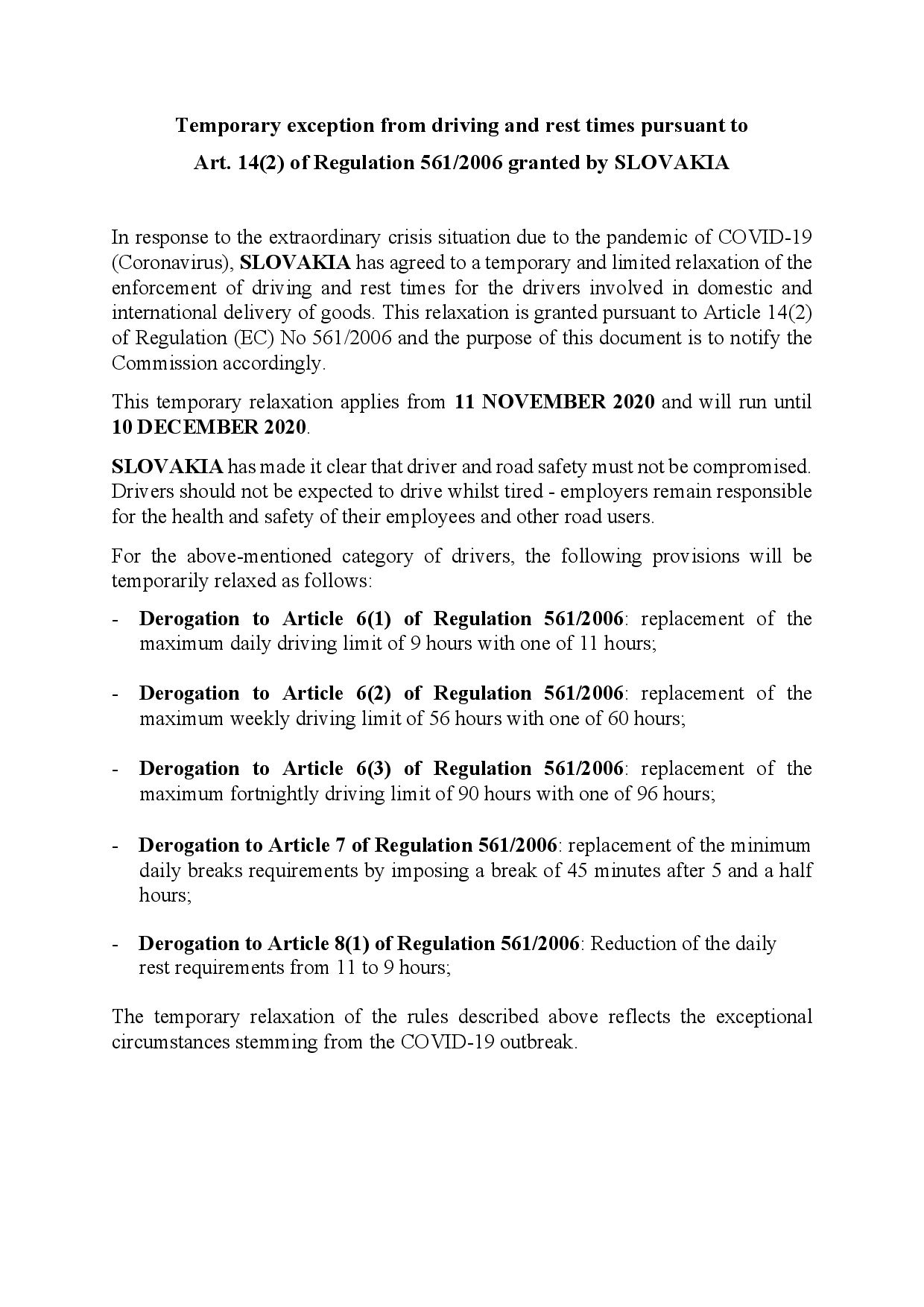 Por lo tanto, Eslovaquia ha acordado una relajación temporal y limitada de la aplicación de los tiempos de conducción y descanso para los conductores involucrados en la entrega nacional e internacional de mercancías.