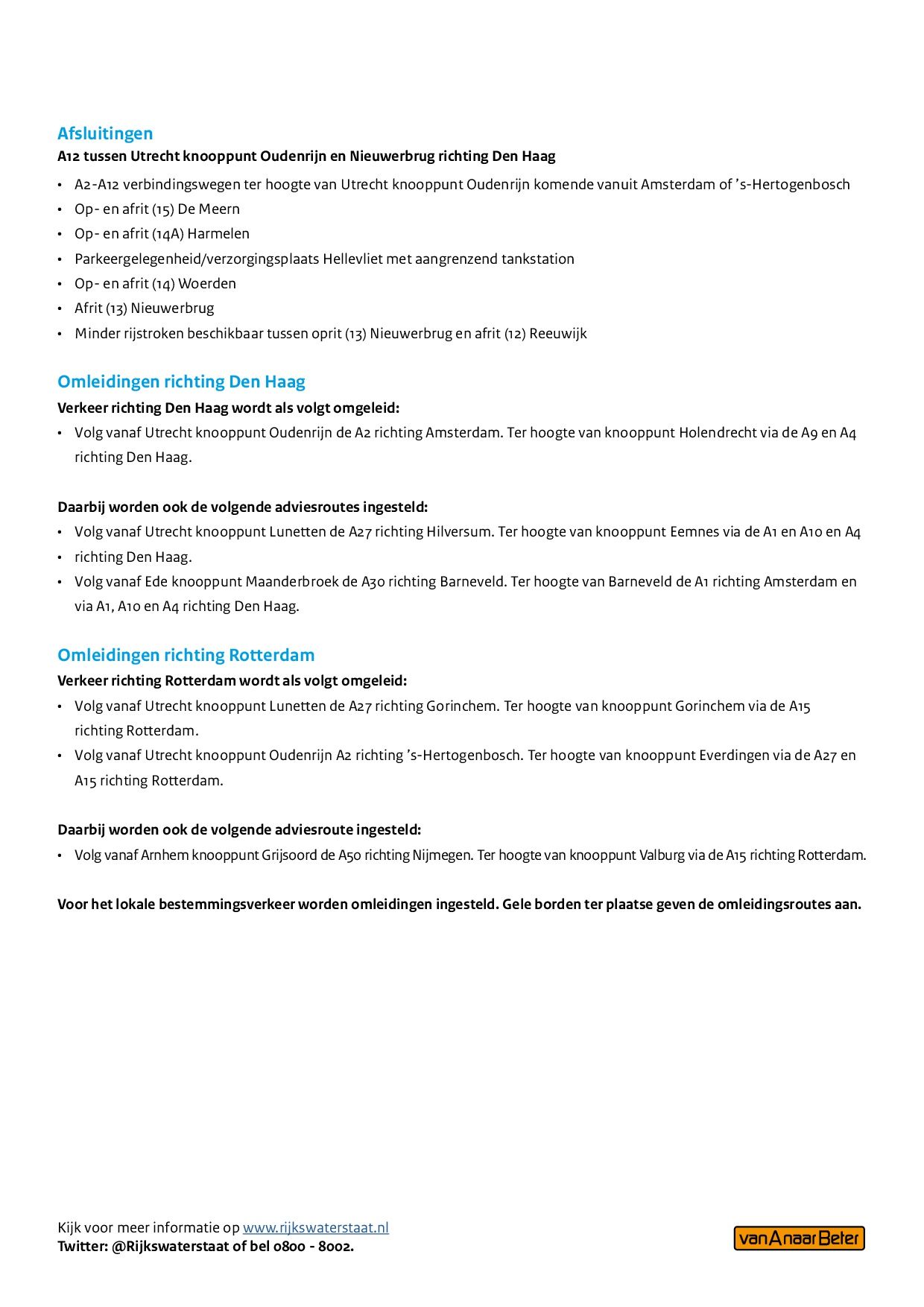 El tráfico que se dirige a La Haya se desviará por la A2, A9 y A4. Tráfico hacia Rotterdam por la A2, A27 y A15. El plan de desvío detallado está disponible en el documento adjunto (en holandés). TLN también preparó un documento traducido al inglés con detalles sobre el trabajo planeado durante estos 9 días (documento adjunto).