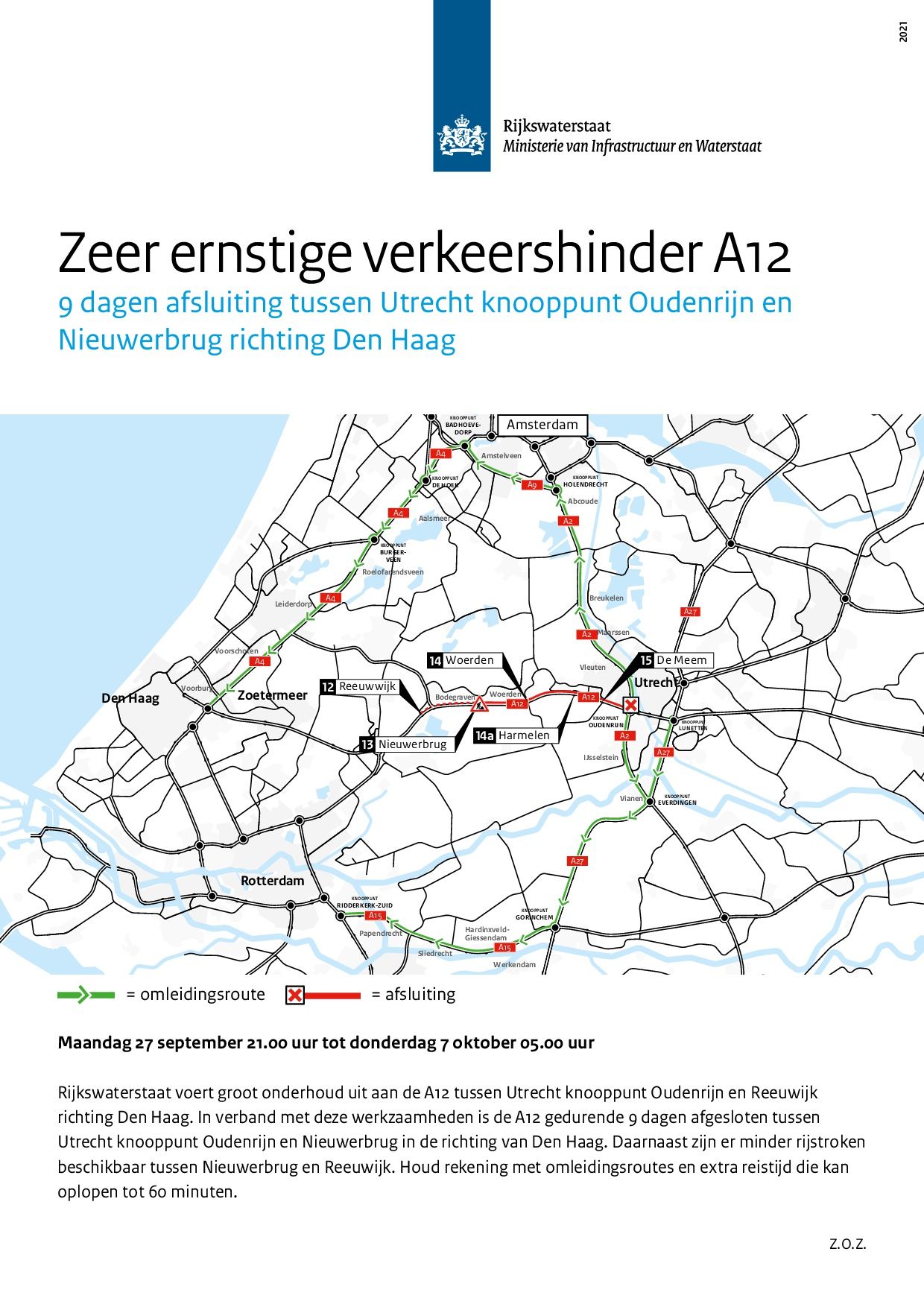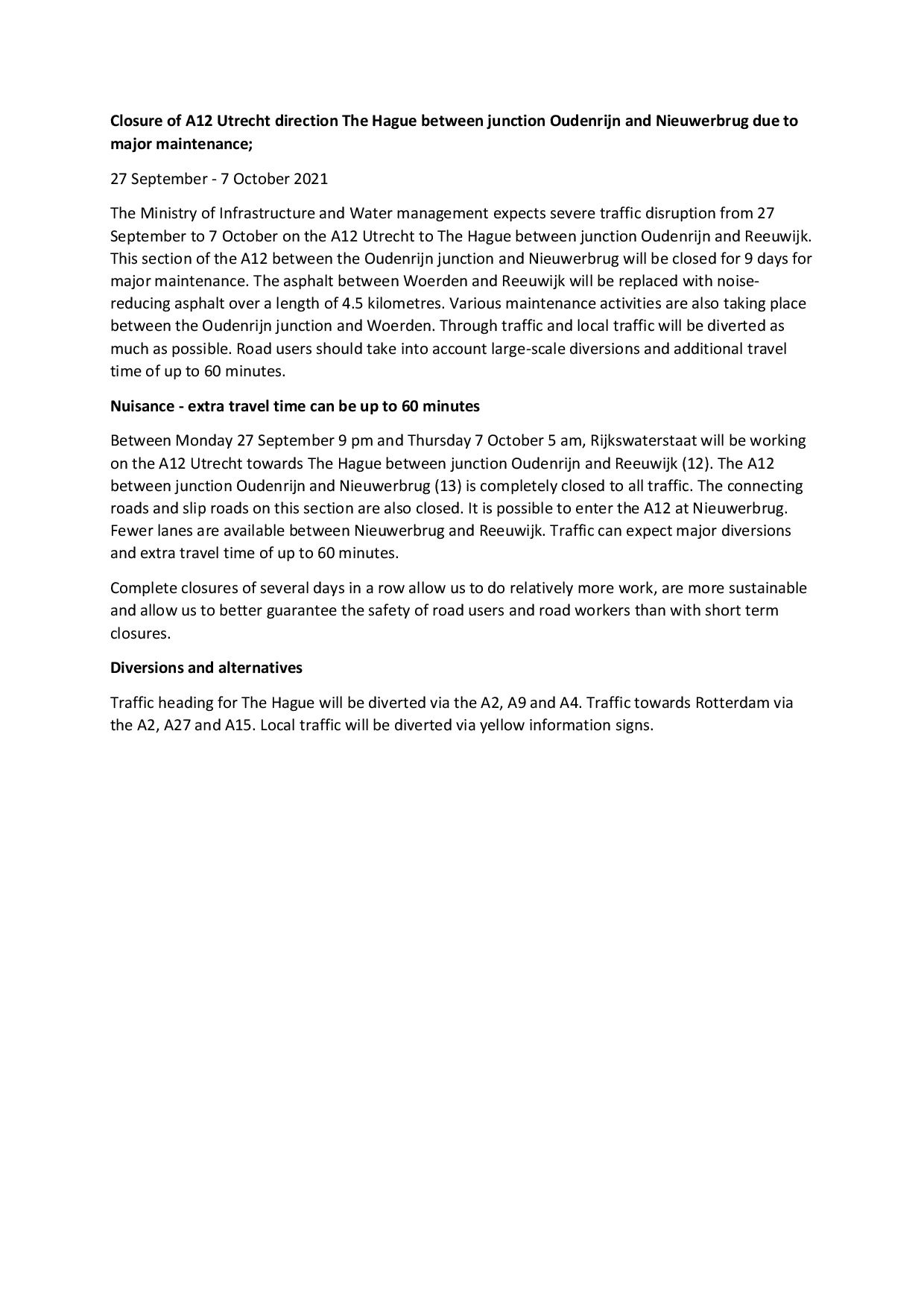 Entre el lunes 27 de septiembre a las 9:00 p.m. y el jueves 7 de octubre a las 5:00 a.m., la autopista A12 en dirección Utrecht-La Haya estará completamente cerrada entre el cruce de Oudenrijn y Nieuwerbrug debido a importantes trabajos de mantenimiento. También se están llevando a cabo actividades de mantenimiento adicionales en todo el tramo entre el cruce de Oudenrijn y Reeuwijk.