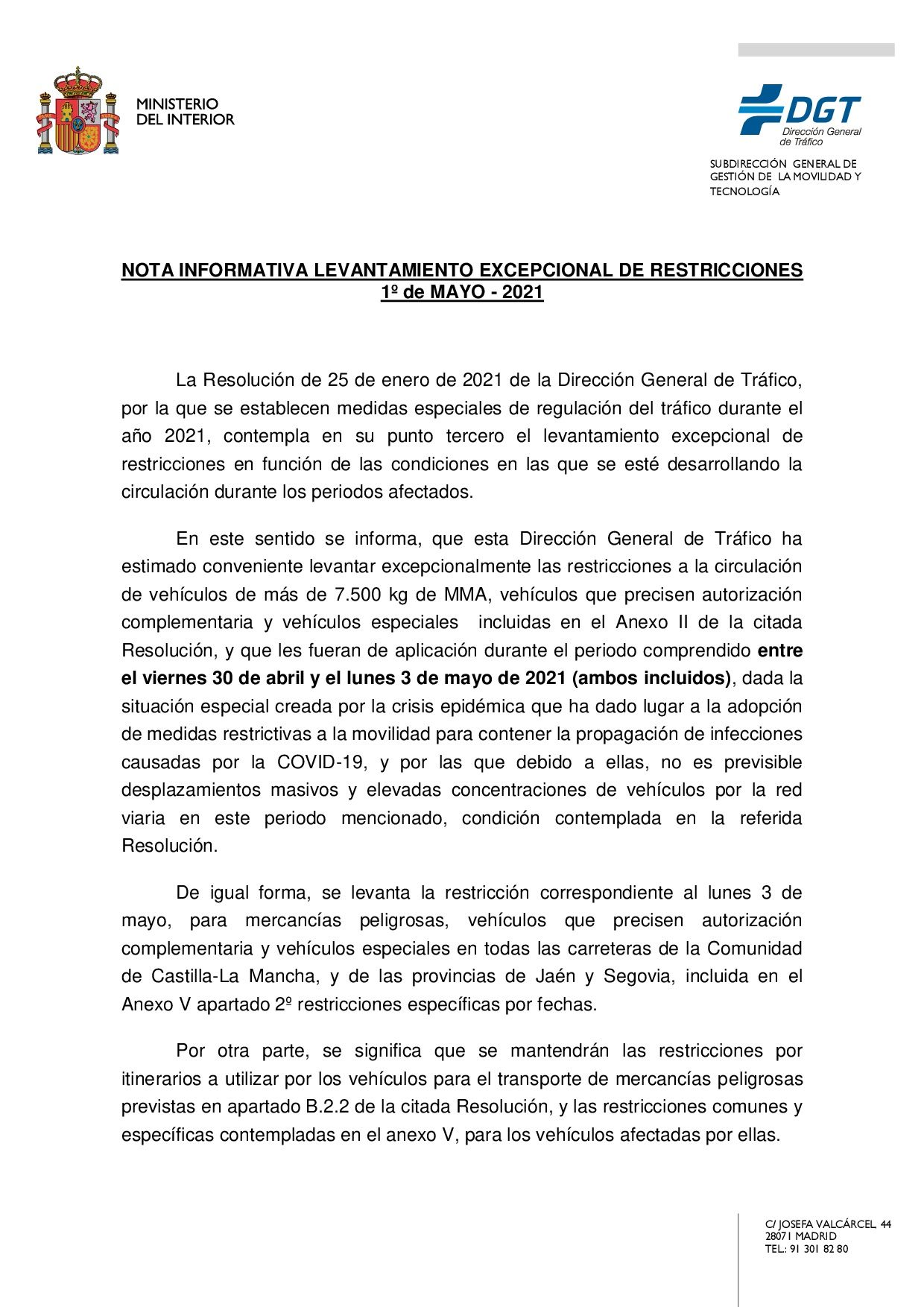 Se remite nota informativa de la Dirección General de Tráfico sobre el levantamiento excepcional de restricciones entre el viernes 30 de abril y el lunes 3 de mayo, ambos inclusive.