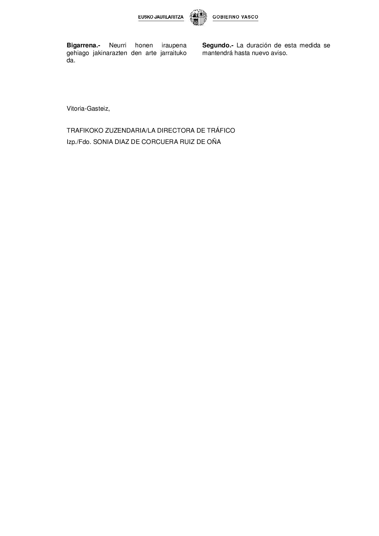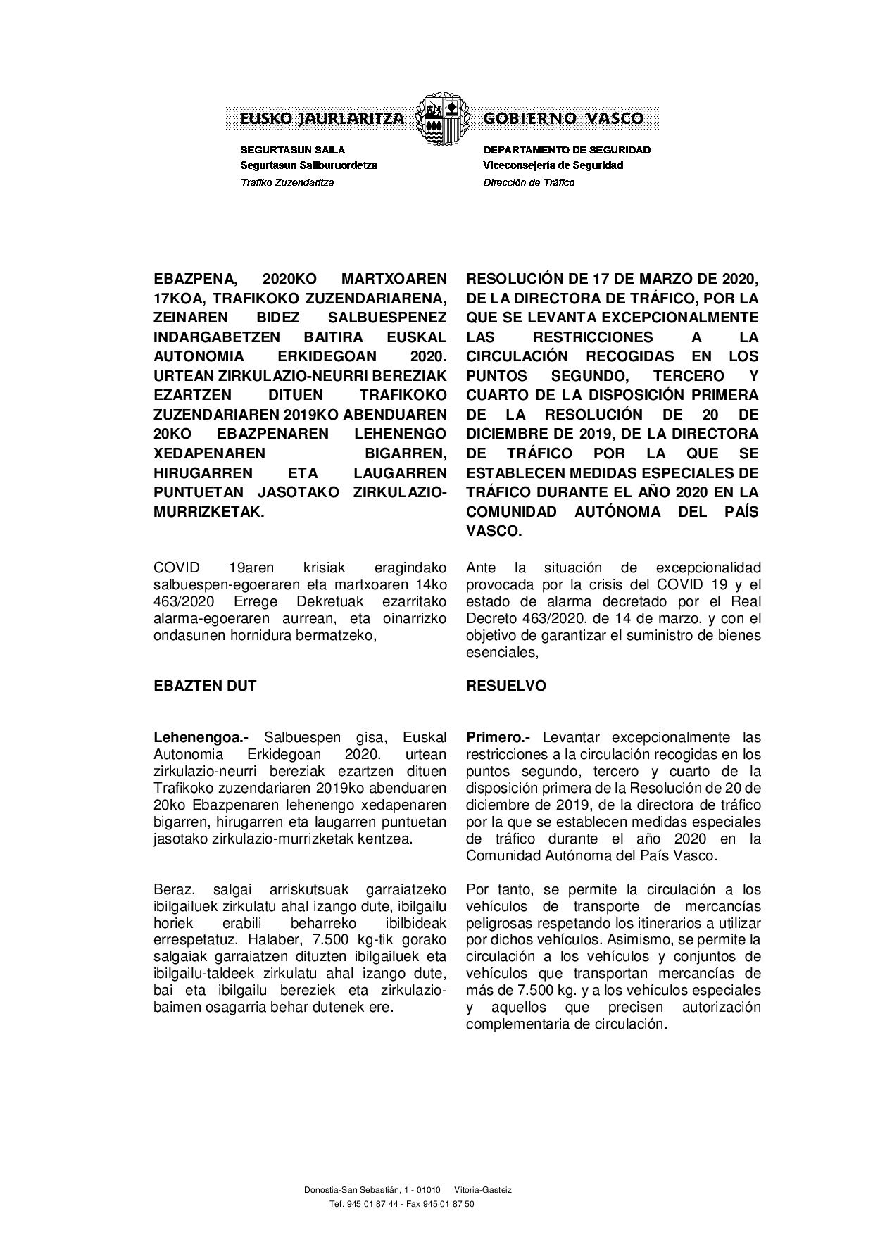 RESOLUCIÓN de la Directora de Tráfico del Gobierno Vasco, del 17 de marzo de 2020, por la que se levanta excepcionalmente las restricciones a la circulación recogidas en los puntos segundo, tercero y cuarto de la disposición primera de la Resolución de 20 de diciembre de 2019, de la Directora de Tráfico por la que se establecen medidas especiales de tráfico durante el año 2020 en la Comunidad Autónoma del País Vasco.