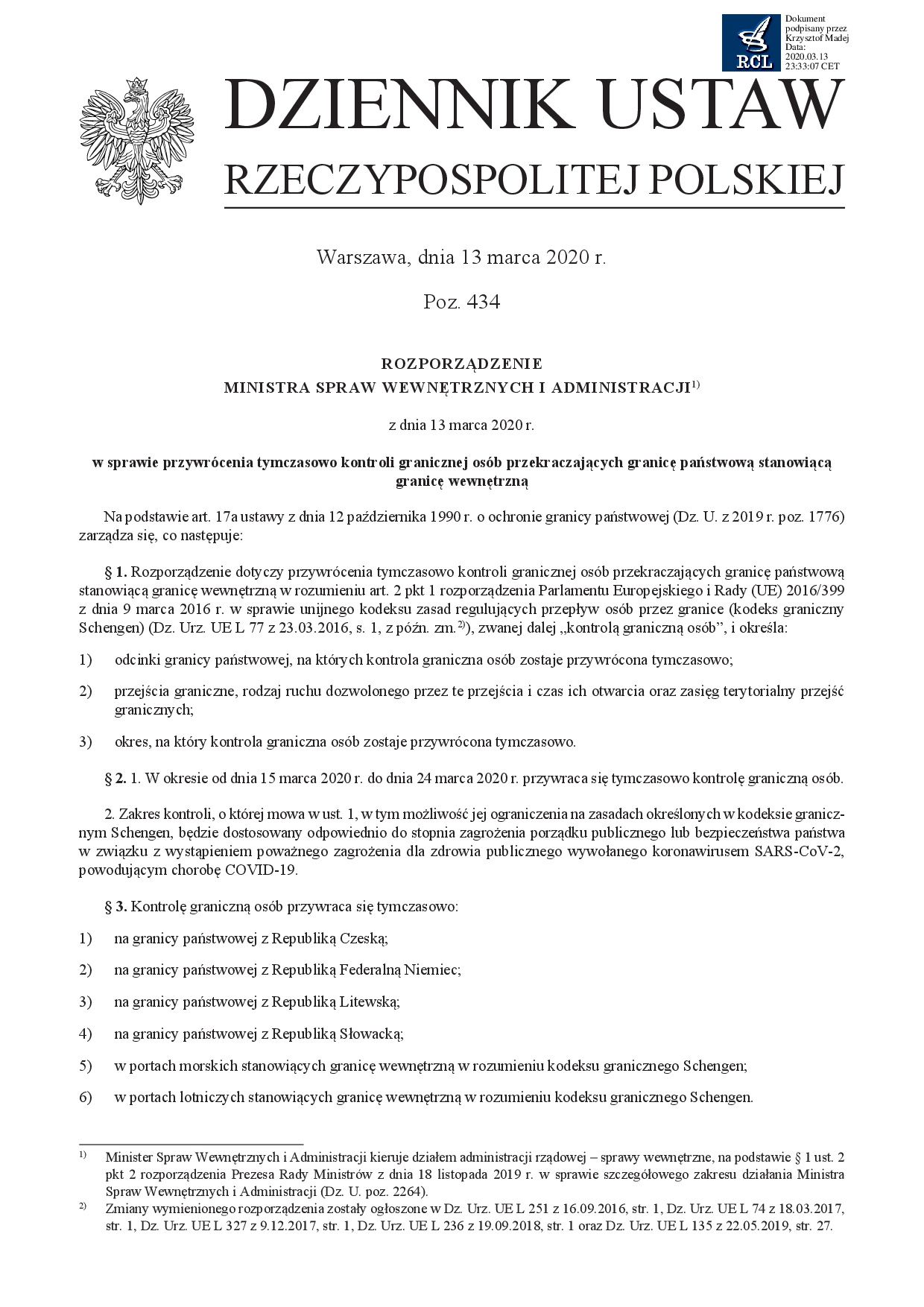 El Primer Ministro de Polonia ha anunciado un "estado de emergencia" tal como hizo ayer el Presidente del Gobierno español. Además de las medidas para limitar las reuniones públicas, el gobierno polaco anunció que el control fronterizo se restablecerá temporalmente desde el 15 de marzo (00:00h) durante 10 días (renovable).