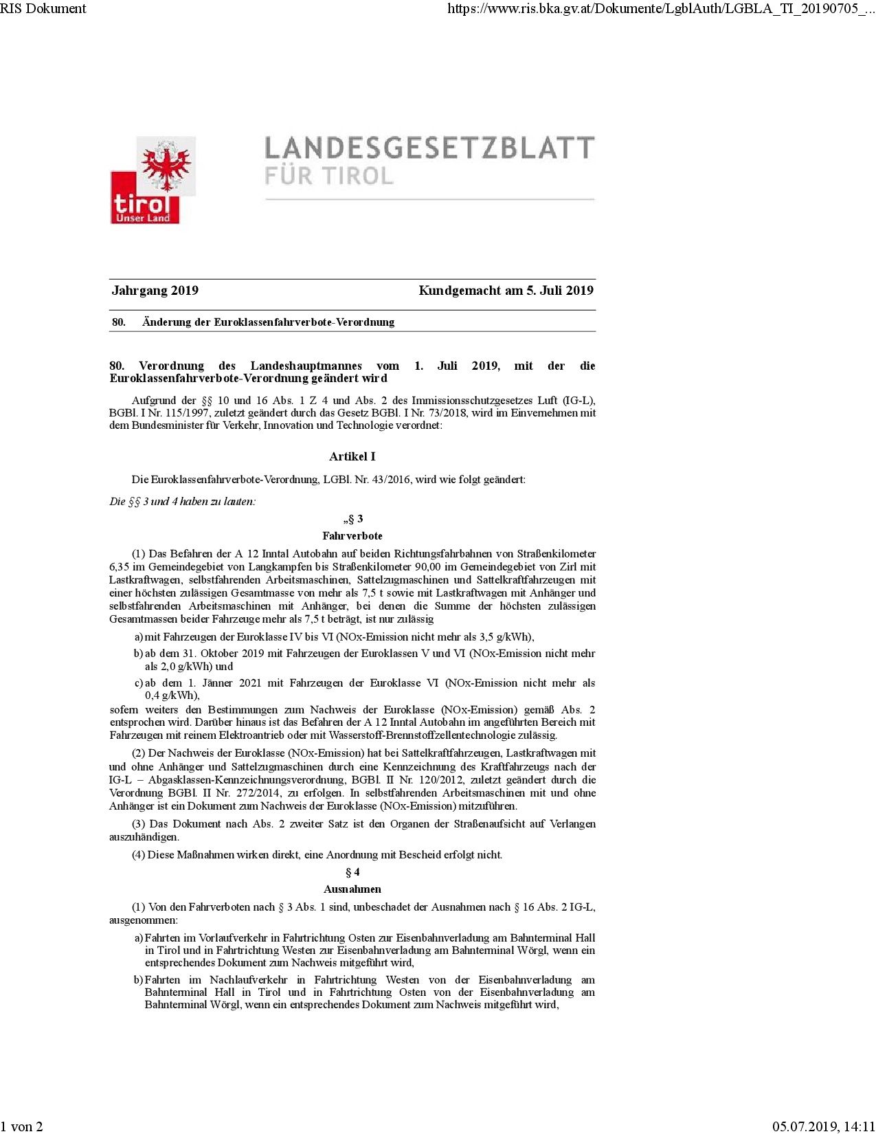 El Gobierno del Estado tirolés modificó el reglamento de prohibición de condución de la Euroclase en la autopista A12.