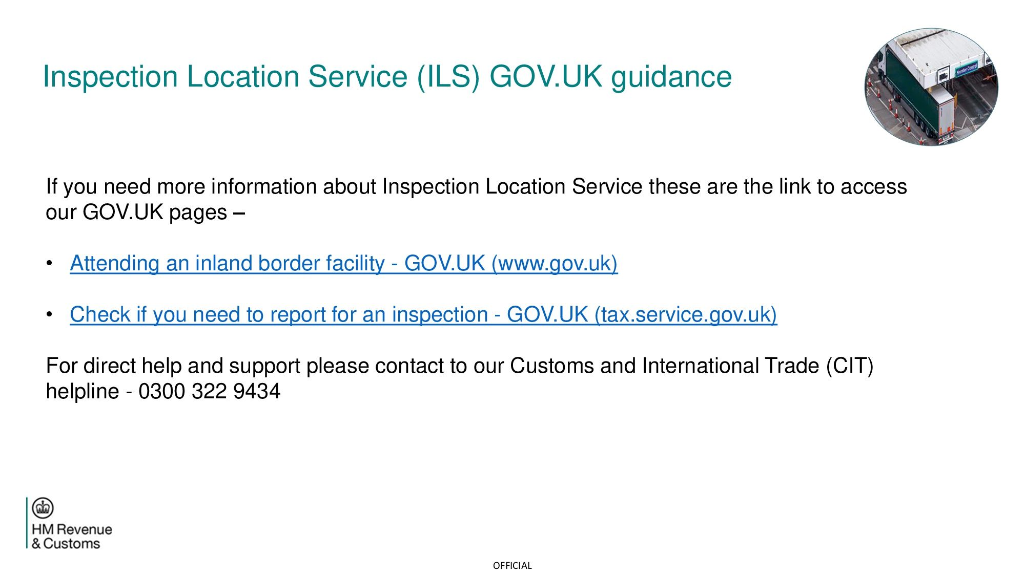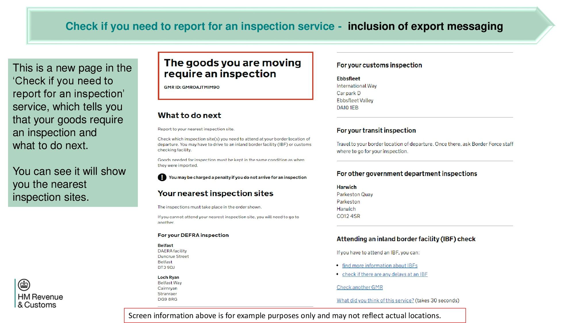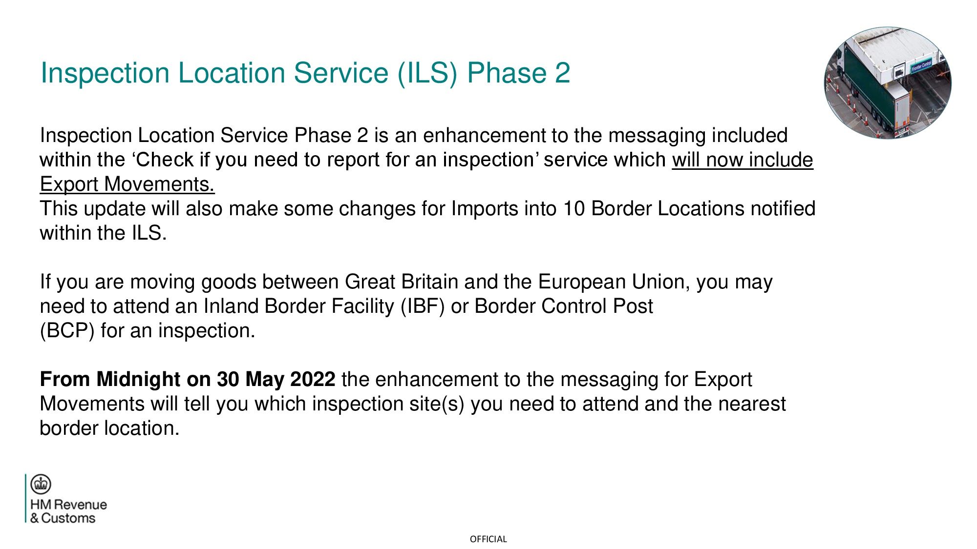 Exportación de bienes desde el Reino Unido: ahora, se supone que cuando se exportan bienes, deben presentarse para su inspección antes de la exportación. A partir del 31 de mayo de 2022, se enviará una notificación de que los bienes deben presentarse para inspección, se indicará el tipo de inspección y se proporcionará una lista de lugares de inspección cercanos. Los operadores de transporte de mercancías por carretera podrán elegir por sí mismos qué lugar de inspección utilizar.
