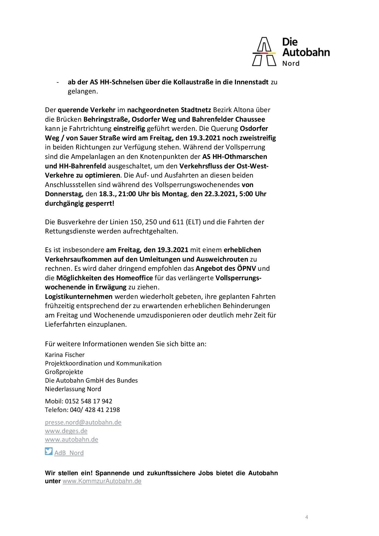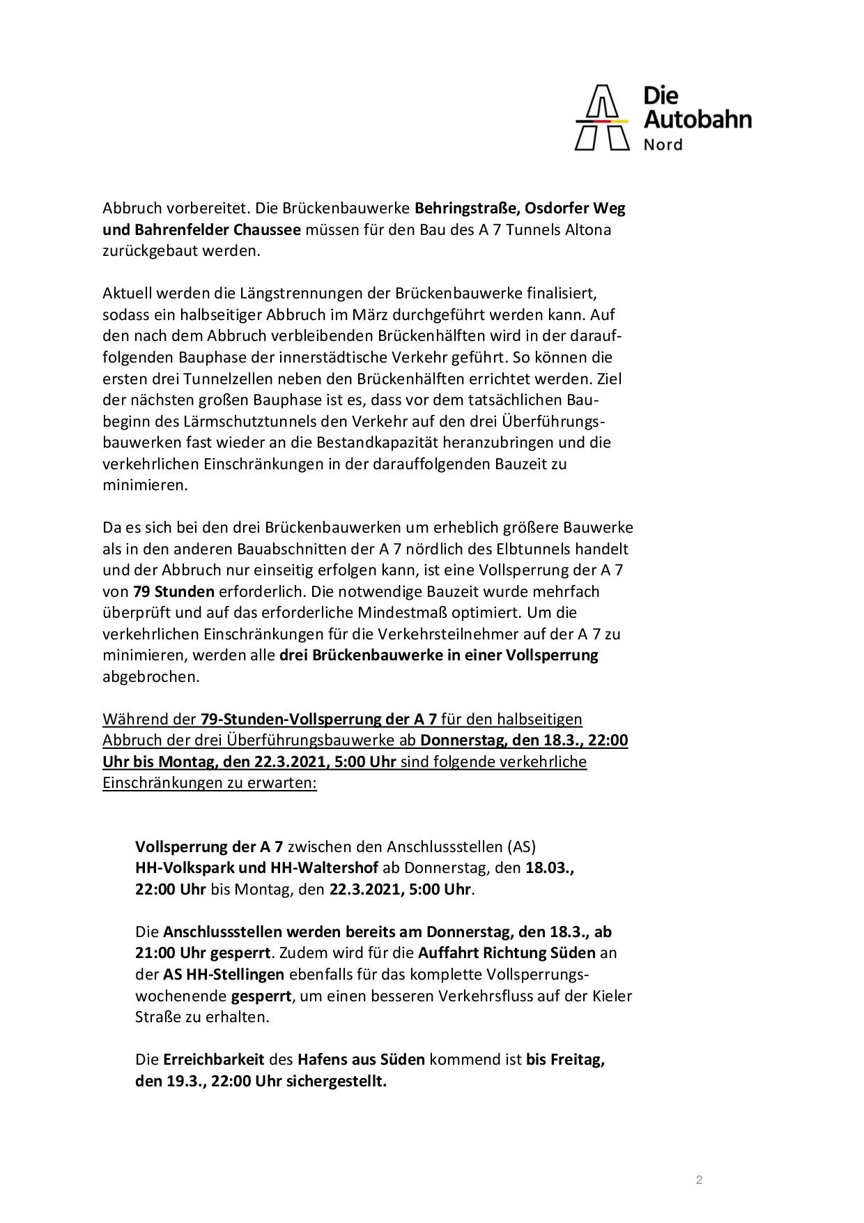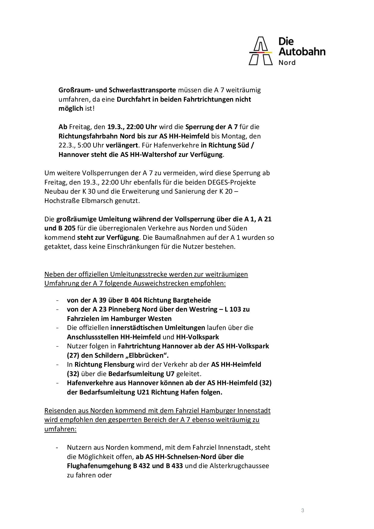 El tráfico que no tenga que ir a Hamburgo debe utilizar con urgencia la extensa circunvalación desde Horster Dreieck / Maschener Kreuz hasta la A1 por la A21 y B205 hasta AS NMS Süd para regresar a la A7 en dirección norte. Lo mismo se aplica al tráfico por el sur.