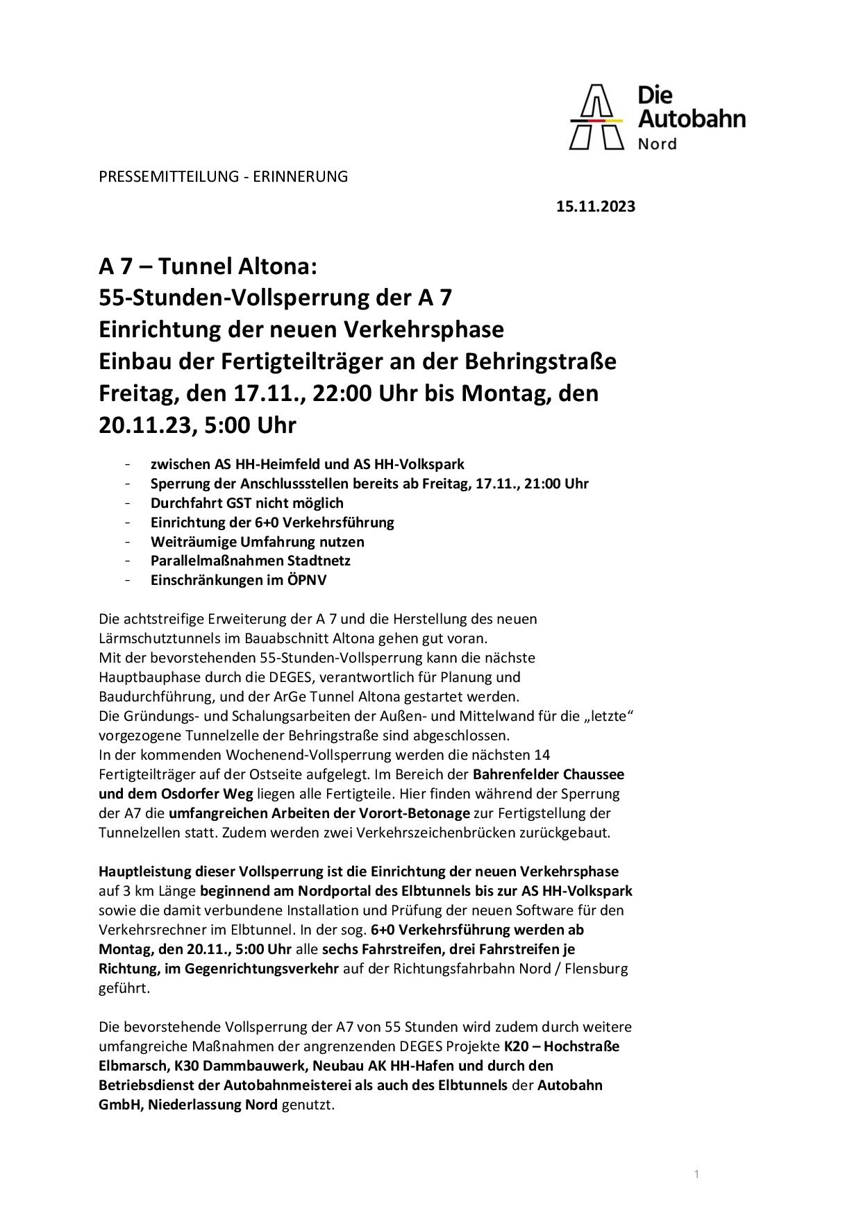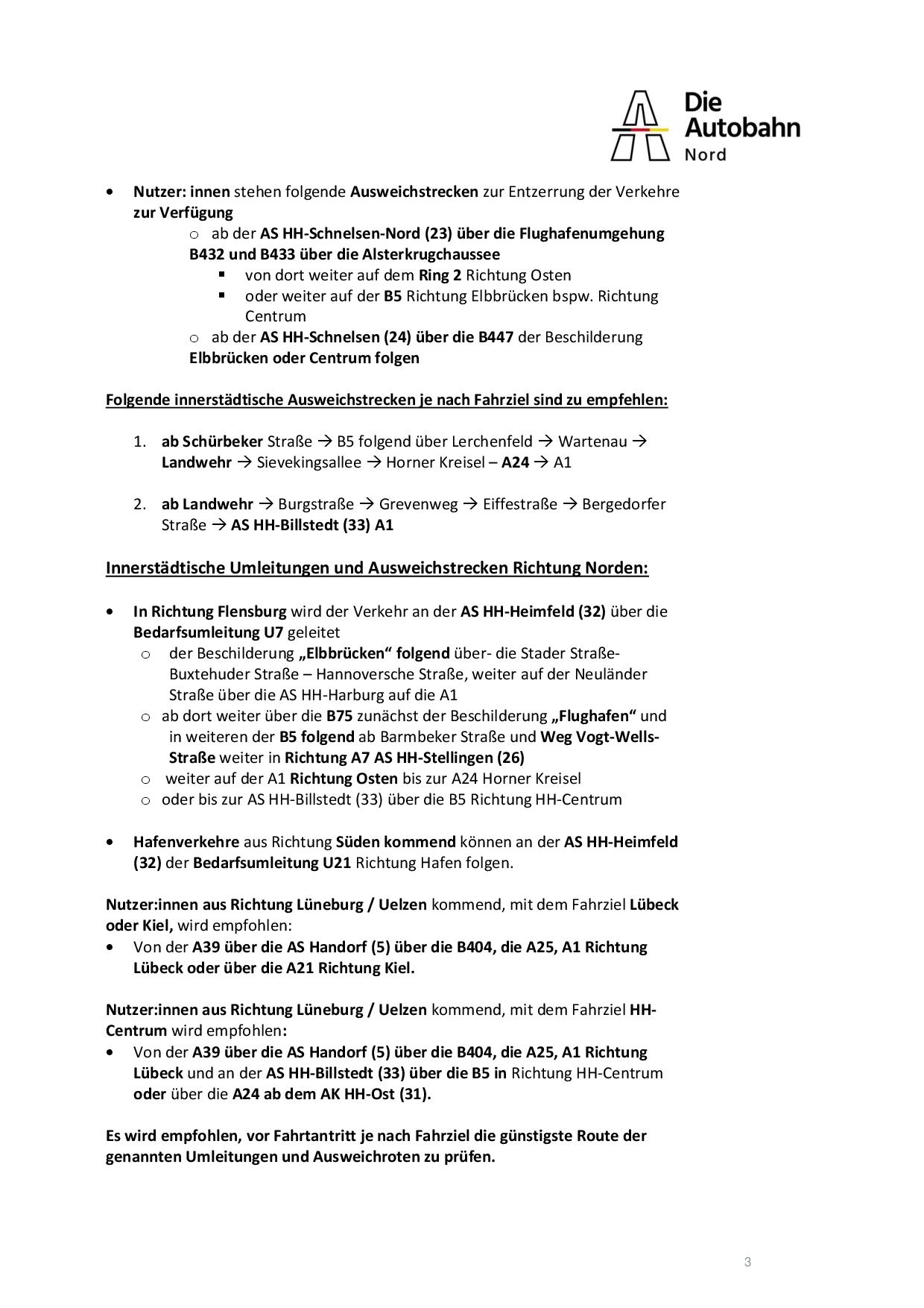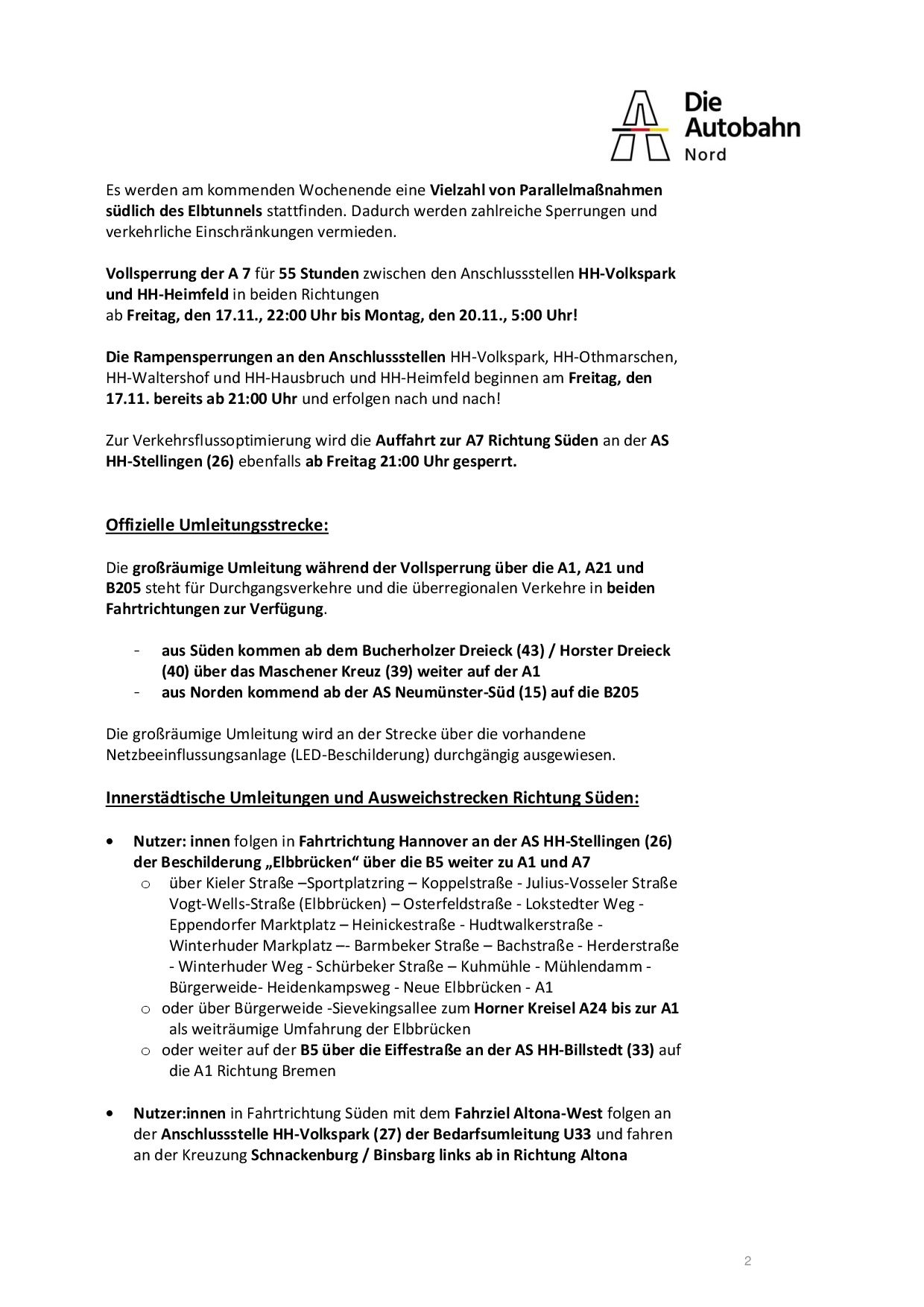 El cierre de rampas en los cruces HH-Volkspark (27), HH-Othmarschen (29), HH-Waltershof (30), HH-Waltershof (31) y HH-Heimfeld (32) comenzará el viernes 17 de noviembre a partir de las 21:00h. Para optimizar el flujo de tráfico, la vía de acceso a la A7 en dirección sur en el cruce HH-Stellingen (26) también estará cerrada a partir del viernes a las 21:00 horas.