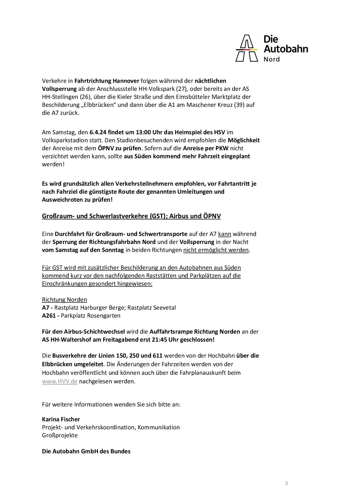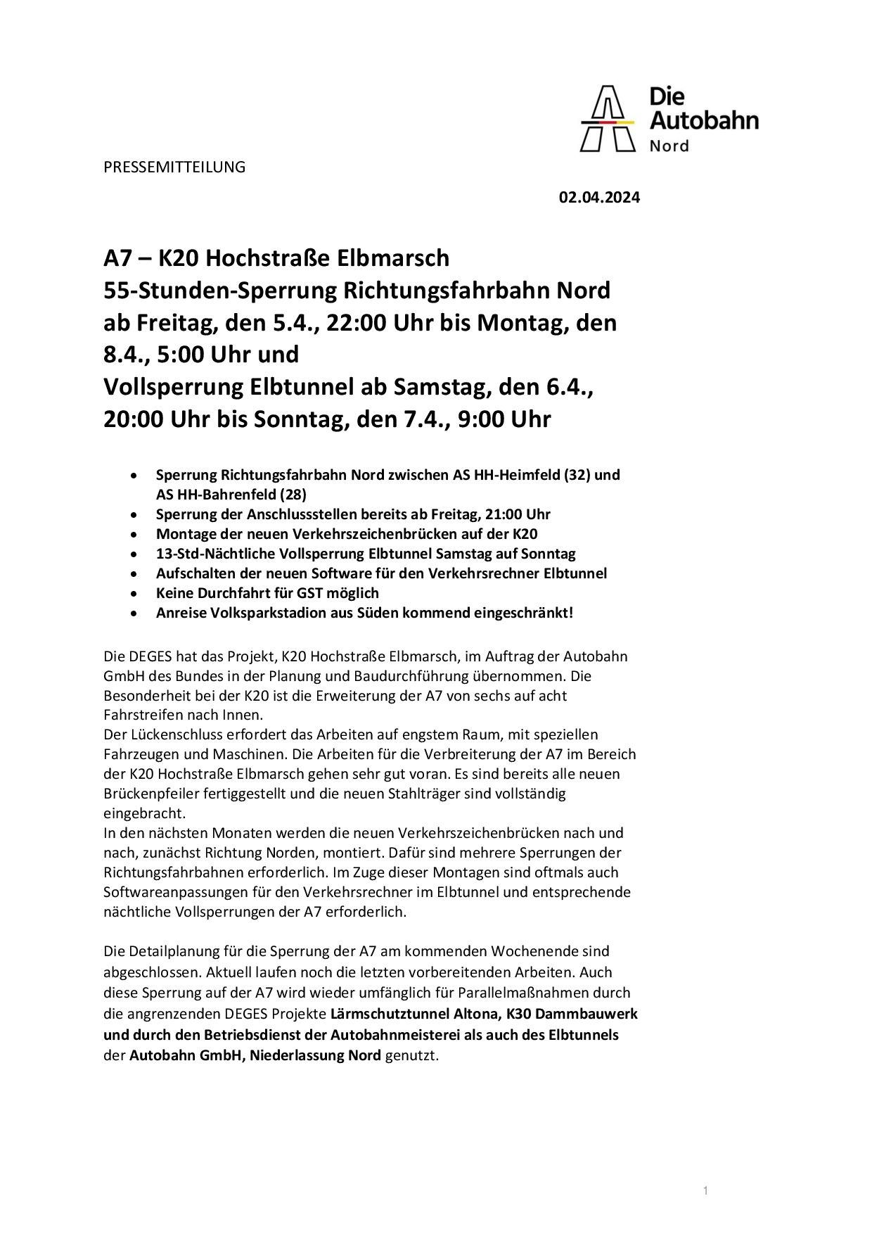 Die Autobahn GmbH des Bundes informa sobre otro cierre total de la carretera A7. Desde el viernes 5 de abril a las 22:00h hasta el lunes 8 de abril de a las 5:00h la A7 estará completamente cerrada entre las vías de acceso AS HH-Heimfeld (32) y AS HH-Bahrenfeld (28) en dirección norte/Flensburgo.