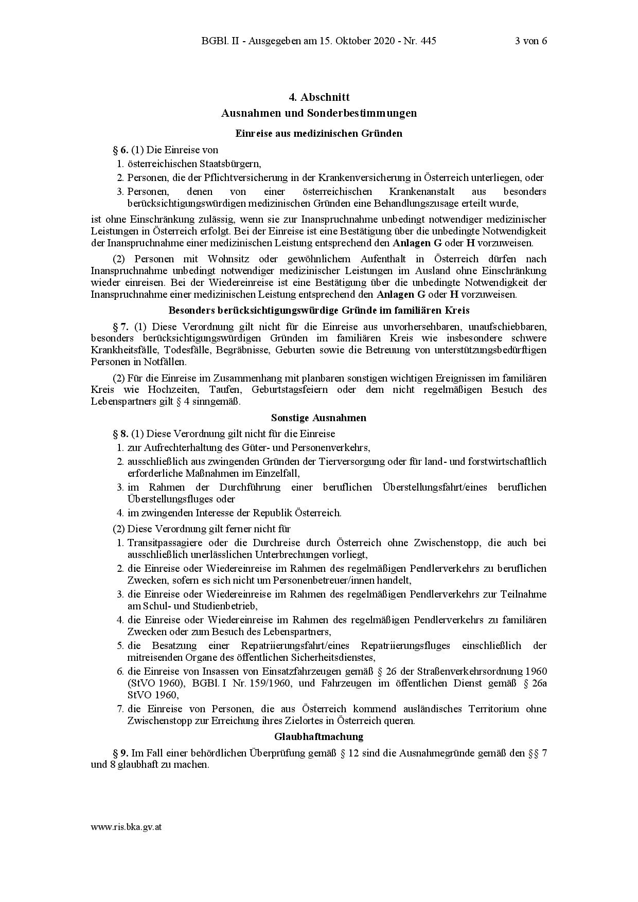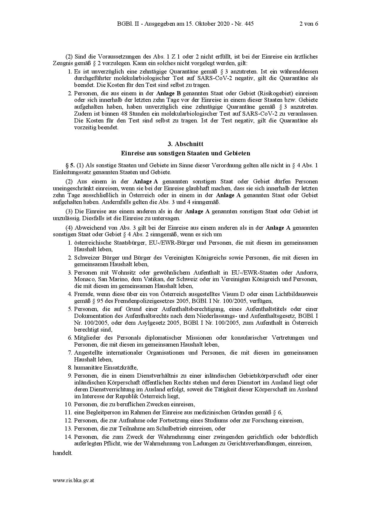 Estas normas entraron en vigor el 17 de octubre de 2020 y permanecerán en vigor hasta el 31 de marzo de 2021. Según las nuevas normas, en general, las personas procedentes de países de la UE / EEE, Suiza, Andorra, Mónaco, San Marino, el Vaticano, los Estados Unidos y Reino Unido (§ 4) puede ingresar sin restricciones si:
