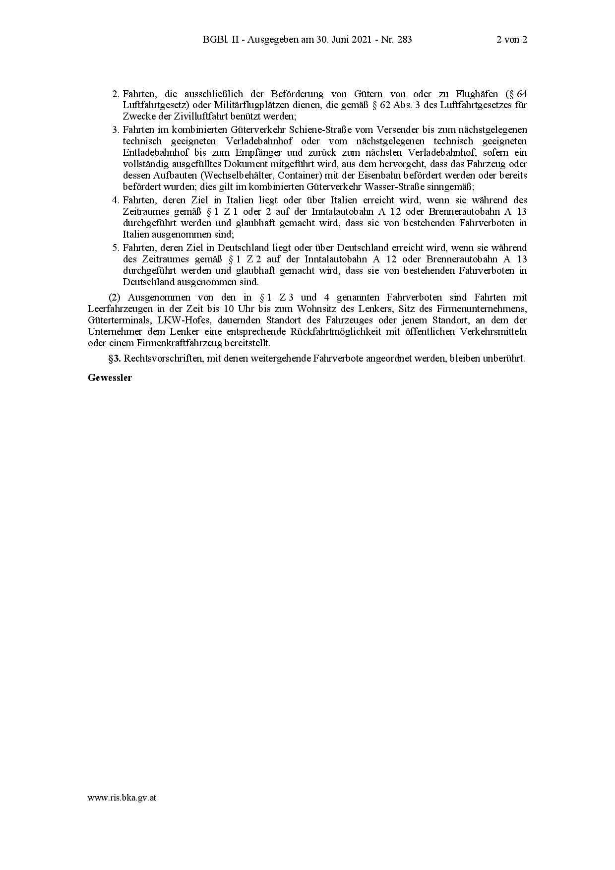 Los vehículos mencionados anteriormente también tendrán prohibido circular por la autopista A 4 del este desde el cruce de Schwechat hasta la frontera del estado de Nickelsdorf en ambas direcciones todos los sábados desde el 3 de julio de 2021 hasta el 28 de agosto de 2021 inclusive entre las 8h am y las 3h pm, con la excepción del tráfico hacia y desde los distritos de Neusiedl am See, Eisenstadt, Eisenstadt-Umgebung, Rust, Mattersburg, Bruck an der Leitha, Gänserndorf y Korneuburg.