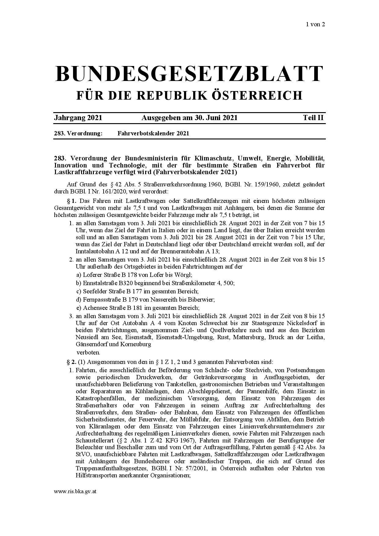 Además, los vehículos mencionados anteriormente tendrán prohibido circular en ambas direcciones los sábados desde el 3 de julio de 2021 hasta el 28 de agosto de 2021 inclusive entre las 8h a.m. y las 3h p.m. en las siguientes carreteras: Loferer Straße B178 von Lofer - Wörgl- Ennstal Straße B320 comenzando en el kilómetro 4.500 de la carretera; - Seefelder Straße B177; - Fernpassstraße B179 Nassereith - Biberwier; - Achensee Straße B181.