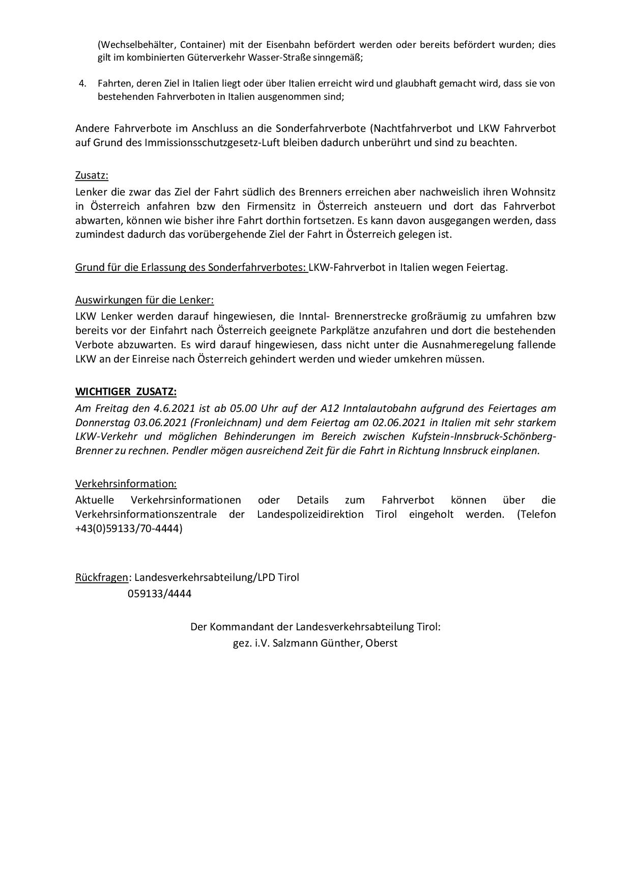 Se aconseja a los conductores de camiones que eviten la ruta Inntal-Brenner en la medida de lo posible o que se acerquen a las zonas de aparcamiento adecuadas antes de entrar en Austria y que esperen allí. Se señala que los camiones que no estén cubiertos por la exención no podrán entrar en Austria y deberán regresar.