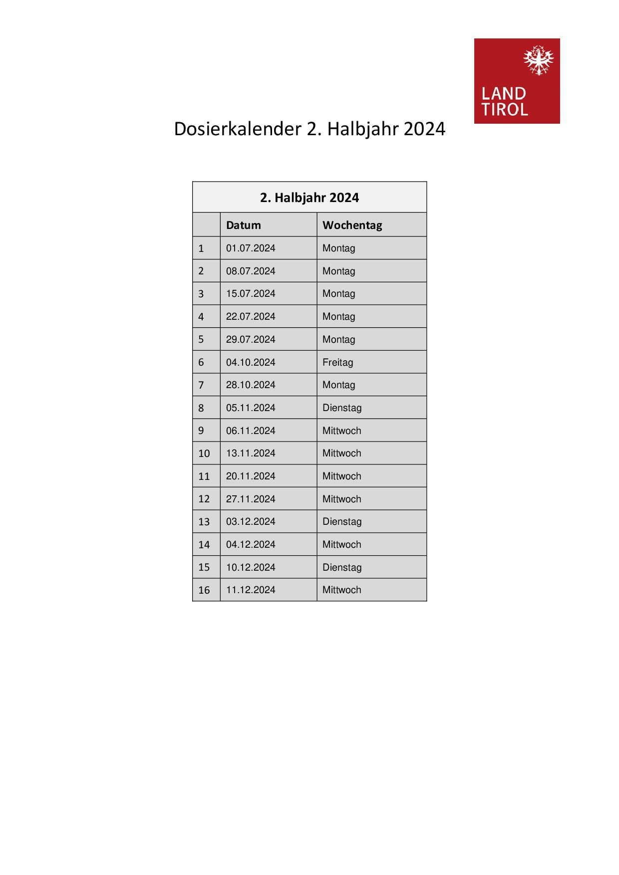 El "Dosierkalender" adjunto ofrece una descripción general de las fechas de las medidas "Blockabfertigung" que implementará el gobierno del Tirol durante la segunda mitad de 2024.