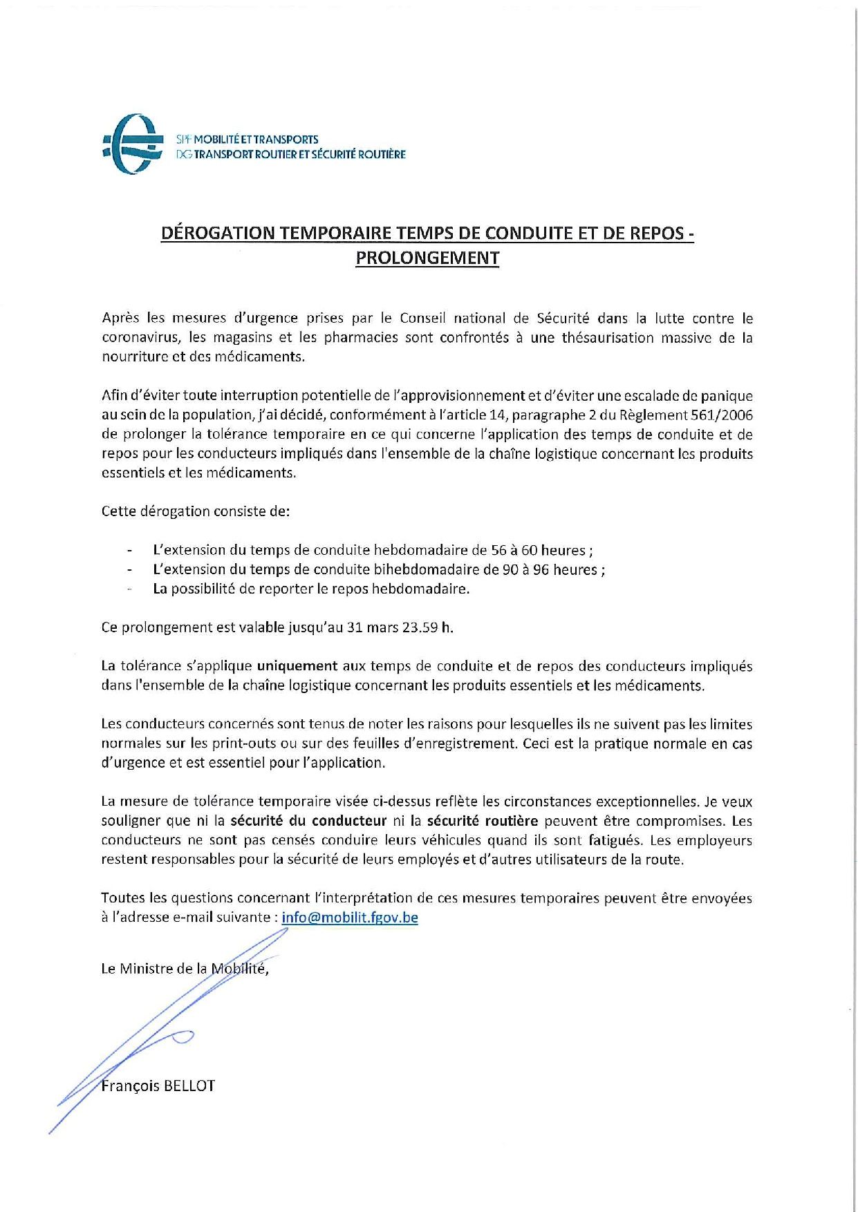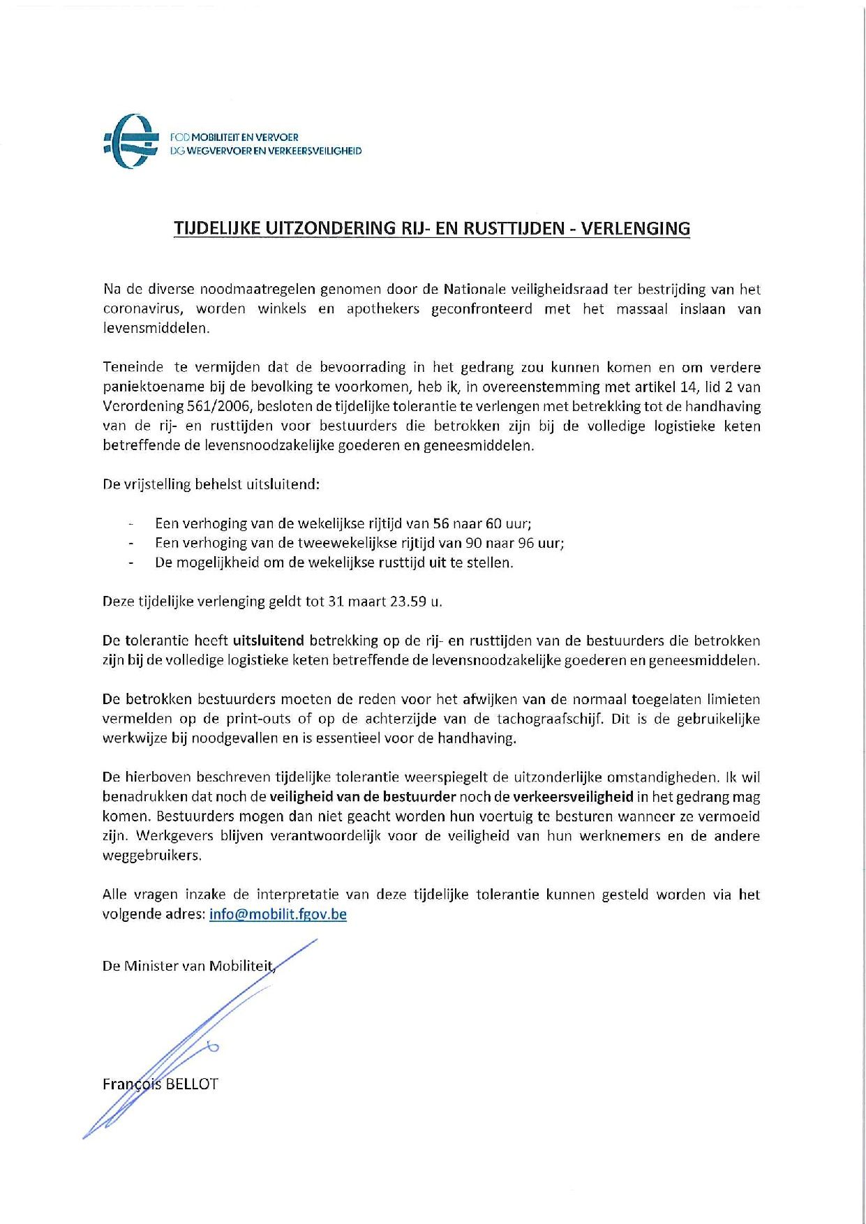 El ministro de transporte anunció una flexibilización/suspensión temporal y completa con respecto a la aplicación de los tiempos de conducción y descanso para los conductores involucrados en el transporte de alimentos, medicamentos y otros bienes esenciales para la vida a tiendas y farmacias. Esta medida se ha tomado sobre la base del artículo 14.2 del Reglamento de la UE 561⁄2006 y se aplica desde el 14⁄03⁄2020 a las 00:01h hasta el 31⁄03⁄202 a las 23:59h. Información más detallada está disponible aquí o descargando el archivo pdf adjunto.