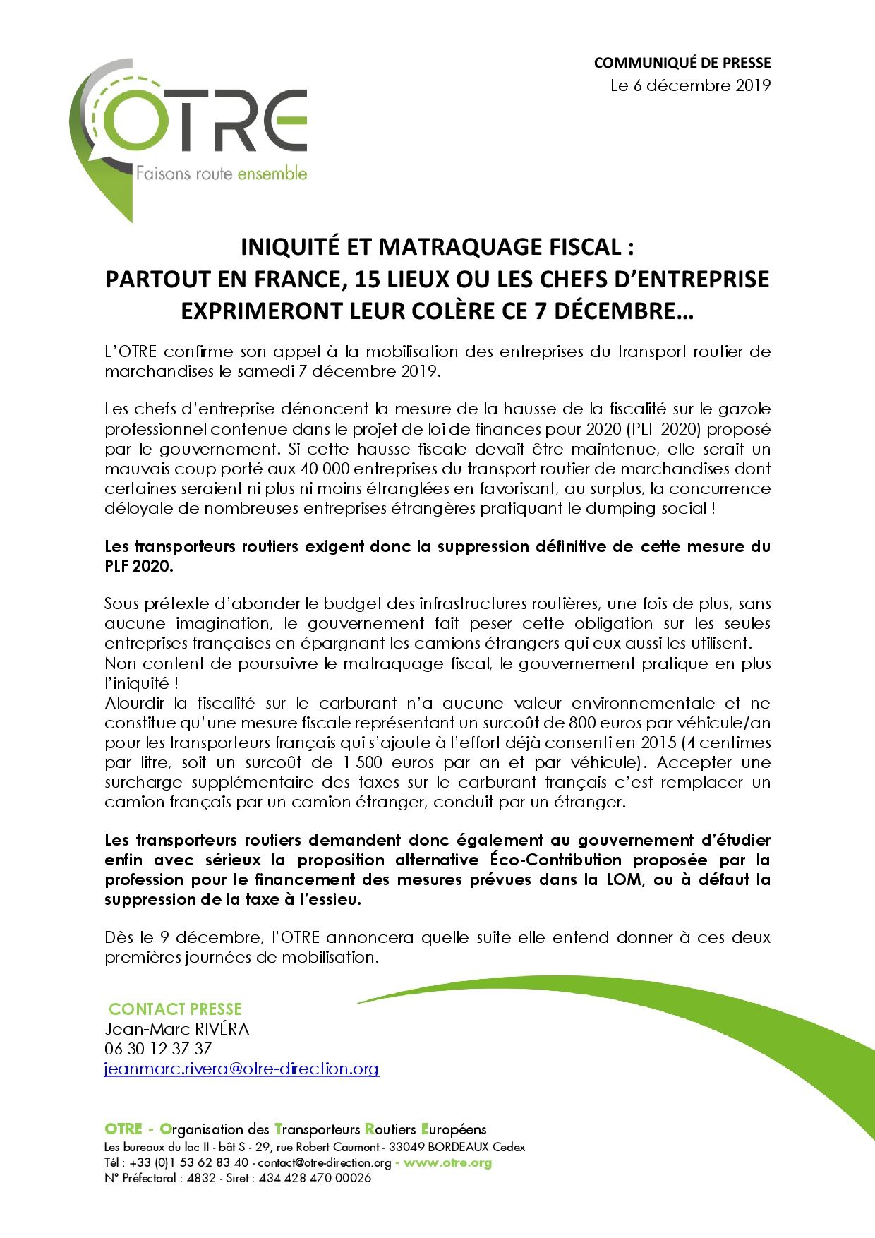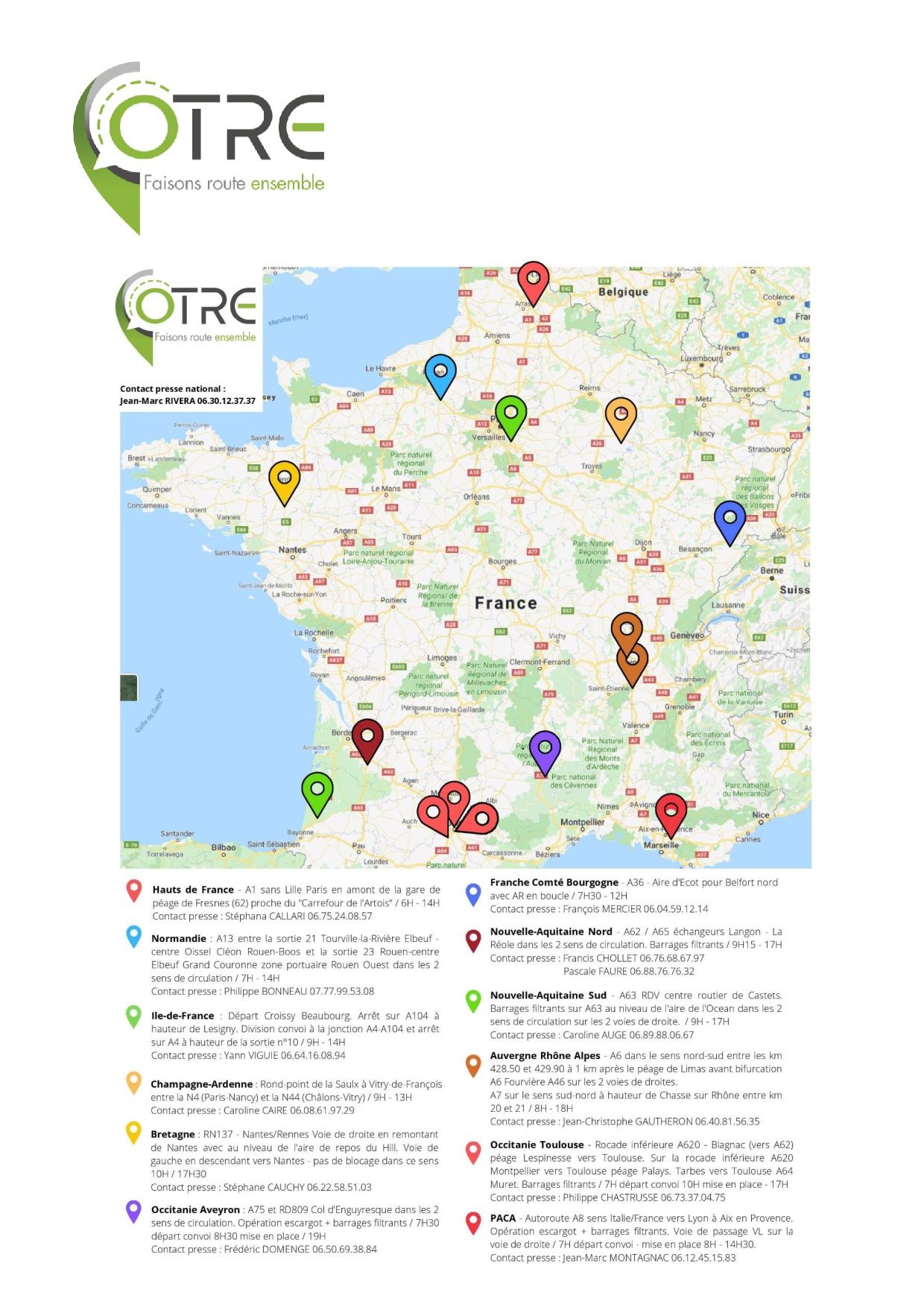 Han elegido una serie de puntos de bloqueo que puede usted encontrar en el archivo anexo que contiene ese mapa y el comunicado de OTRE en que, resumidamente, se expone la indignación e inquietud que les supone el que el Gobierno francés pretenda reducir la cuantía del gasóleo profesional, lo cual se traduce en competencia desleal, según OTRE, de los transportistas extranjeros ya que estos no están afectados en igual proporción por esa subida fiscal.