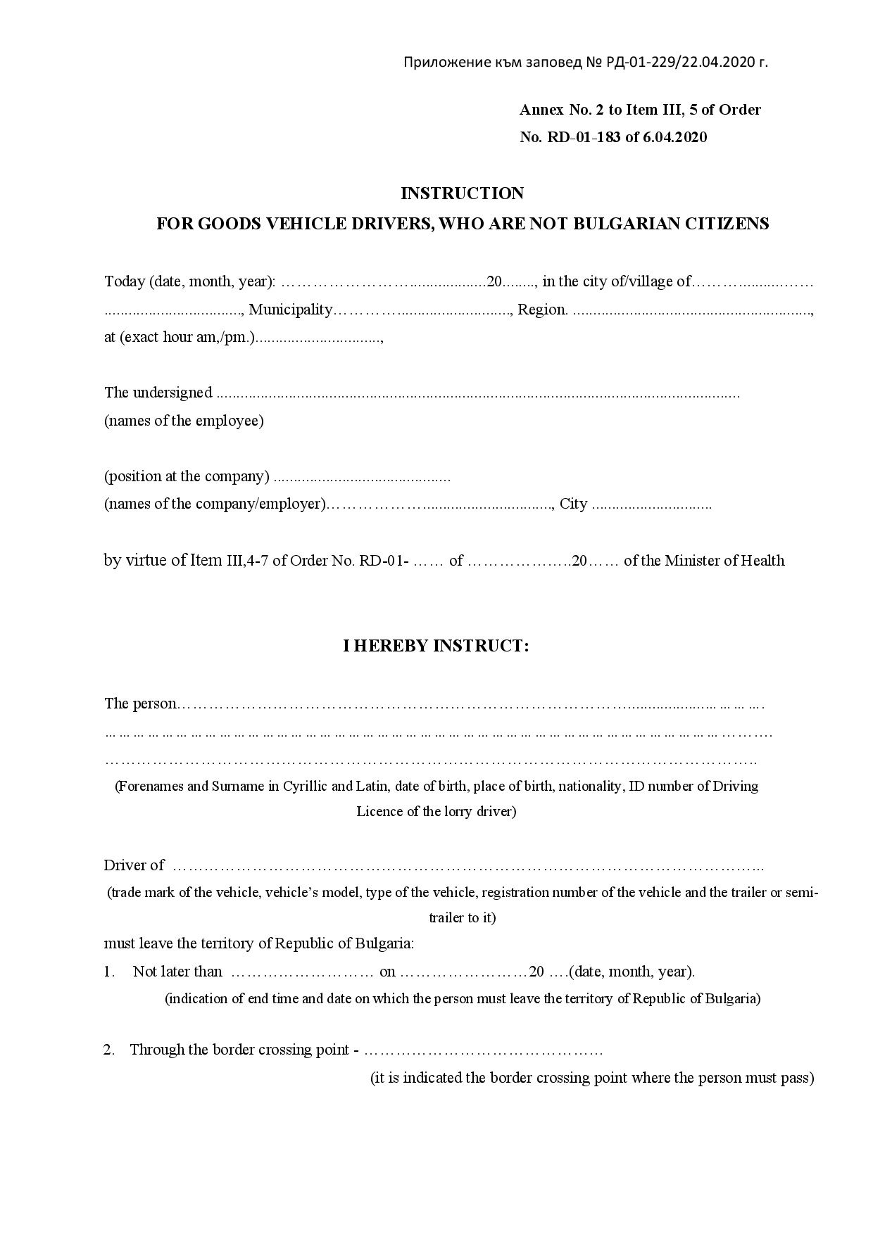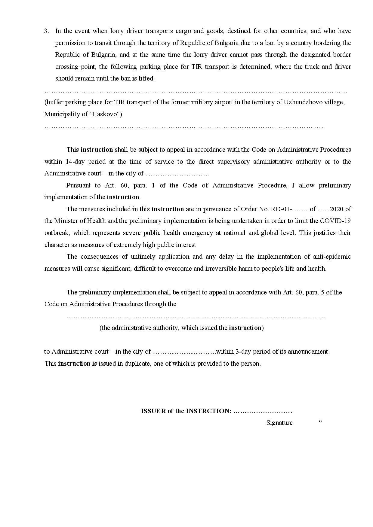 Las autoridades sanitarias fronterizas emitirán una nota de instrucciones (modelo adjunto) para los conductores que pasen por el territorio de la República de Bulgaria especificando: