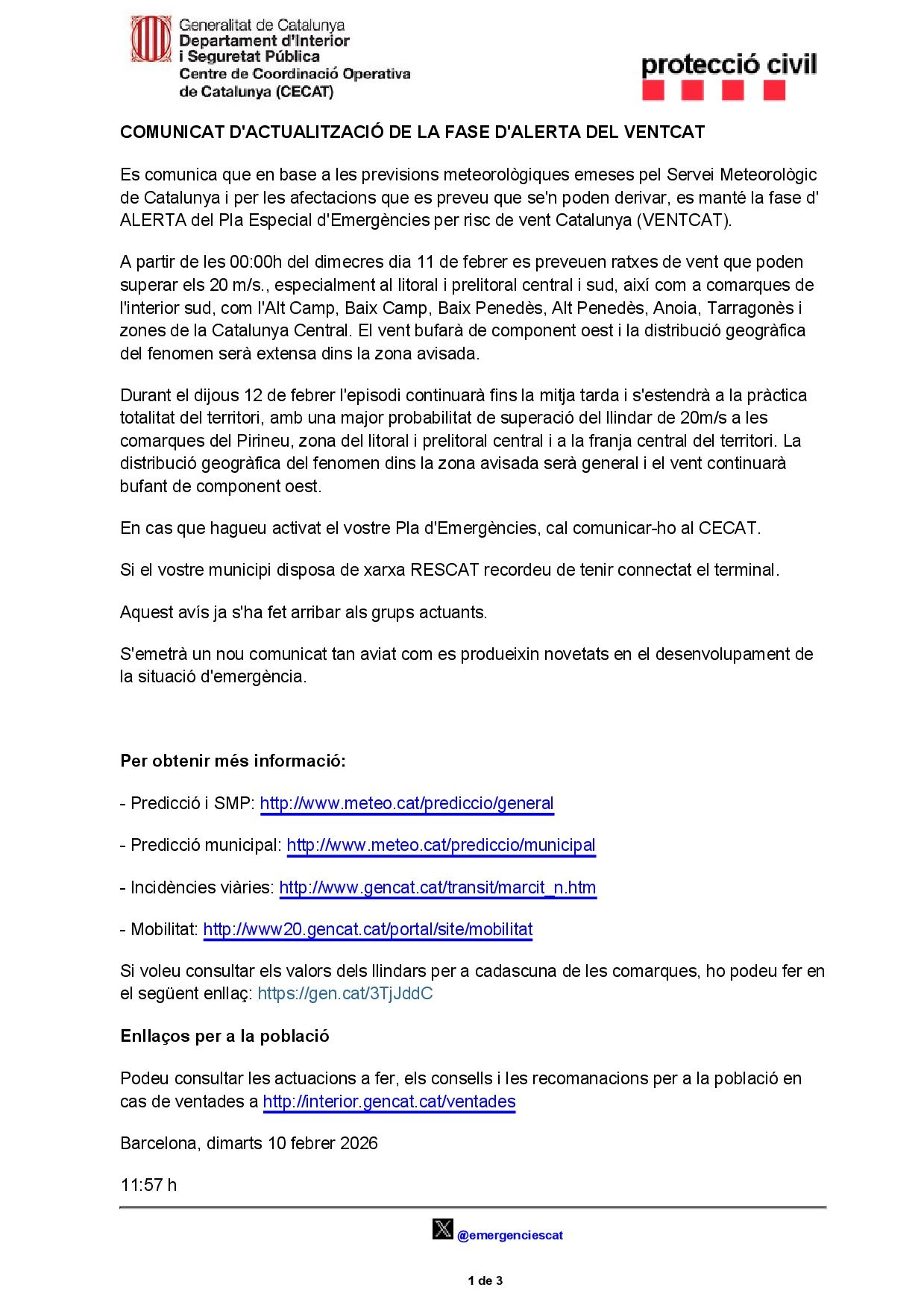 Le informamos que hay previsión de fuertes vientos para mañana y el próximo jueves, tal y como puede ver en el documento adjunto, en las comarcas del Alt y Baix Penedès y Tarragonès, y también en todo el corredor de la A-2, respectivamente. Esta activación puede suponer afectaciones a la circulación, en especial para vehículos de mercancías que circulen vacíos.