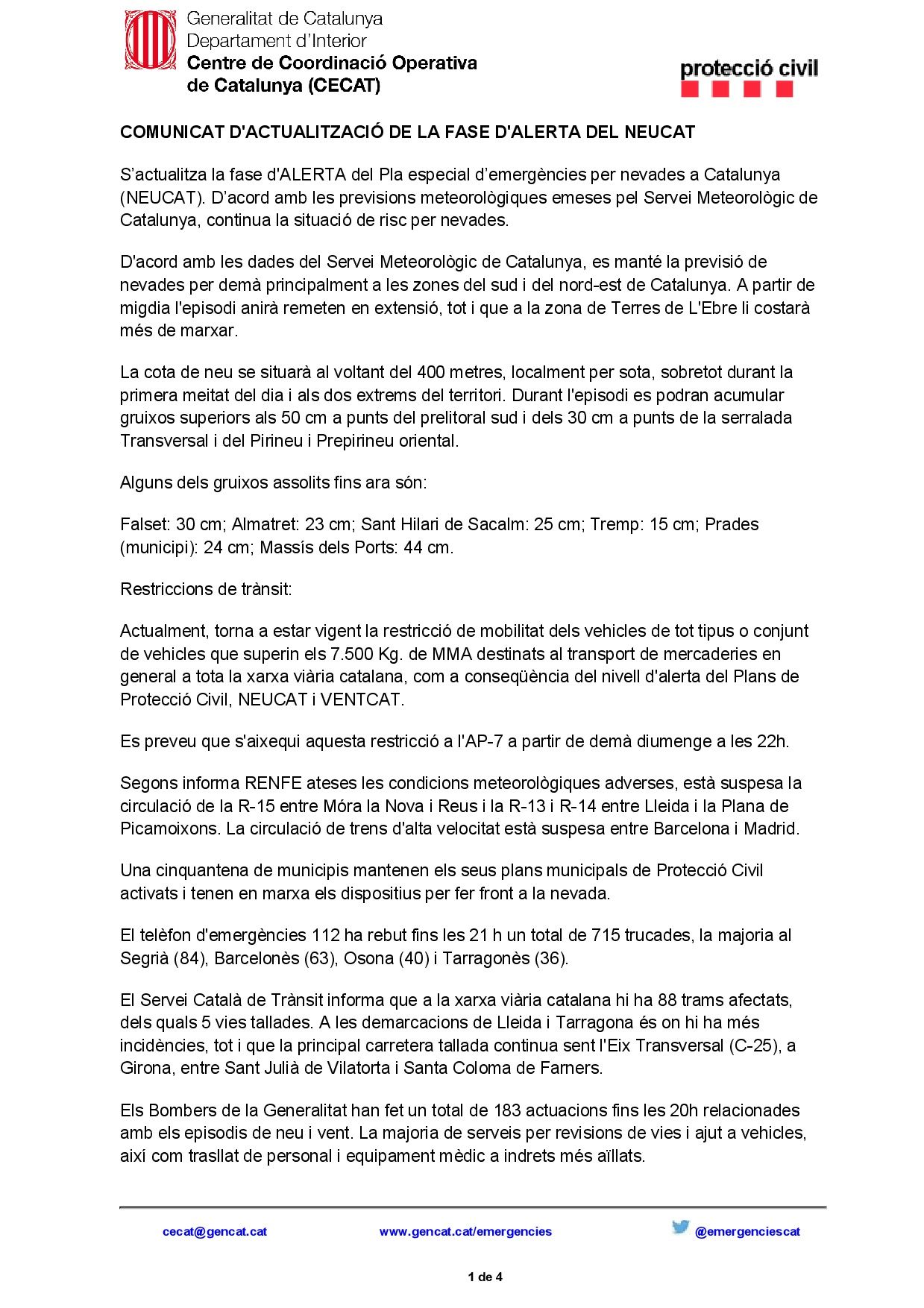 CATALUÑA. ACTUALIZACIÓN ALERTA VIAL POR NEVADAS