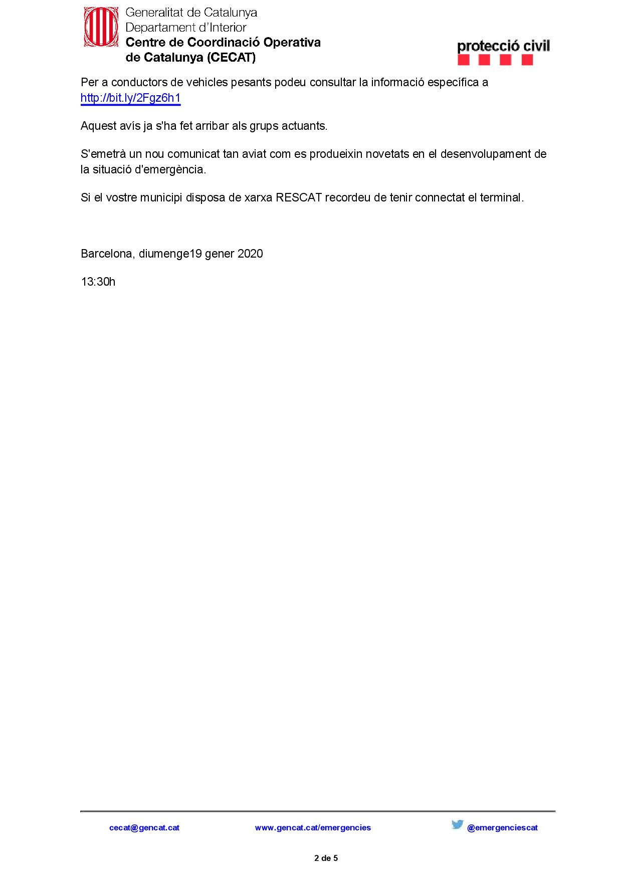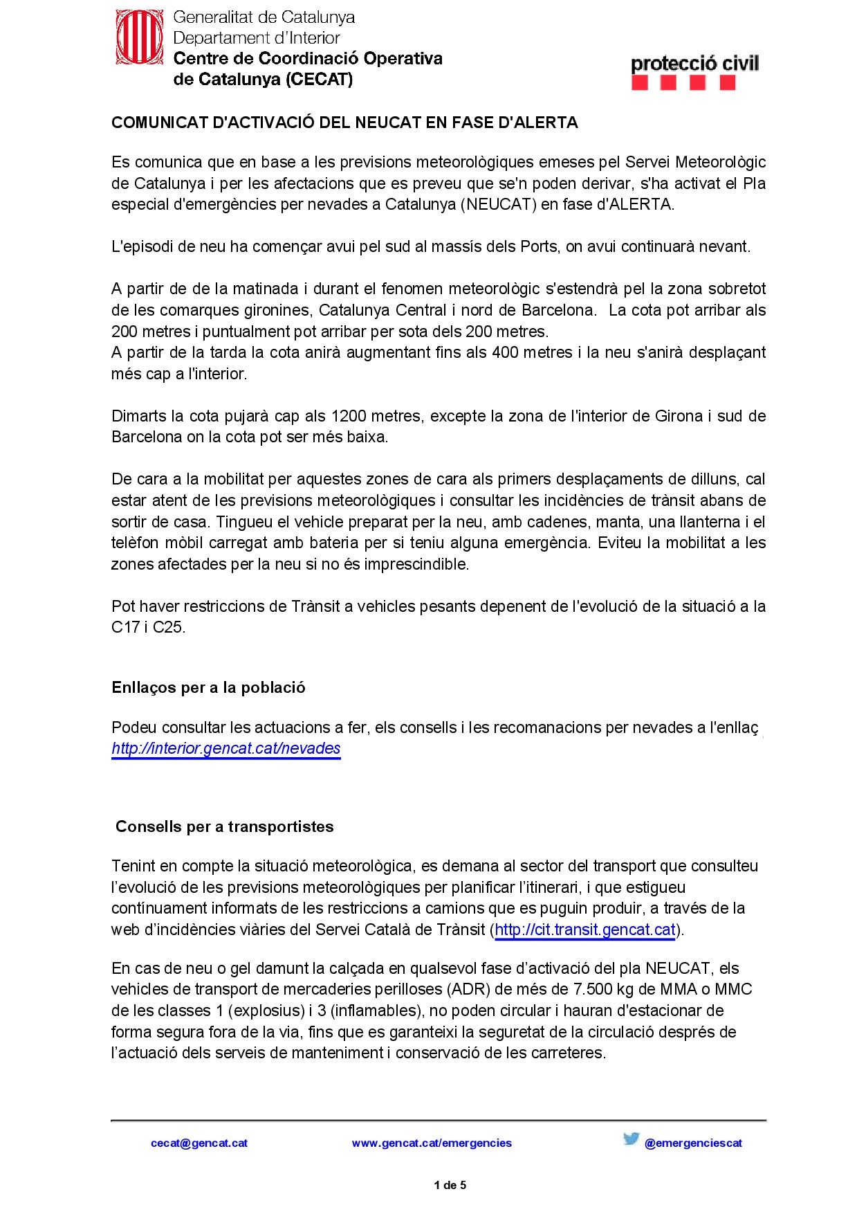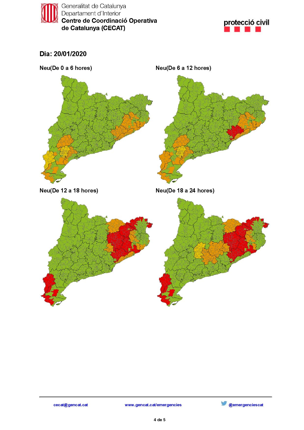 Según comunicación del Comité Técnico del CECAT (Centre d’ Emergències de Catalunya), reunido esta tarde, se actualiza la fase de ALERTA del Plan Especial de nevadas en Catalunña (NEUCAT). En vista de la previsión meteorológica emitida por el Servei Meteorológic de Cataluña, continua la situación de riesgo de nevadas. Véanse las previsiones para mañana día 20 y el martes 21 de enero —>