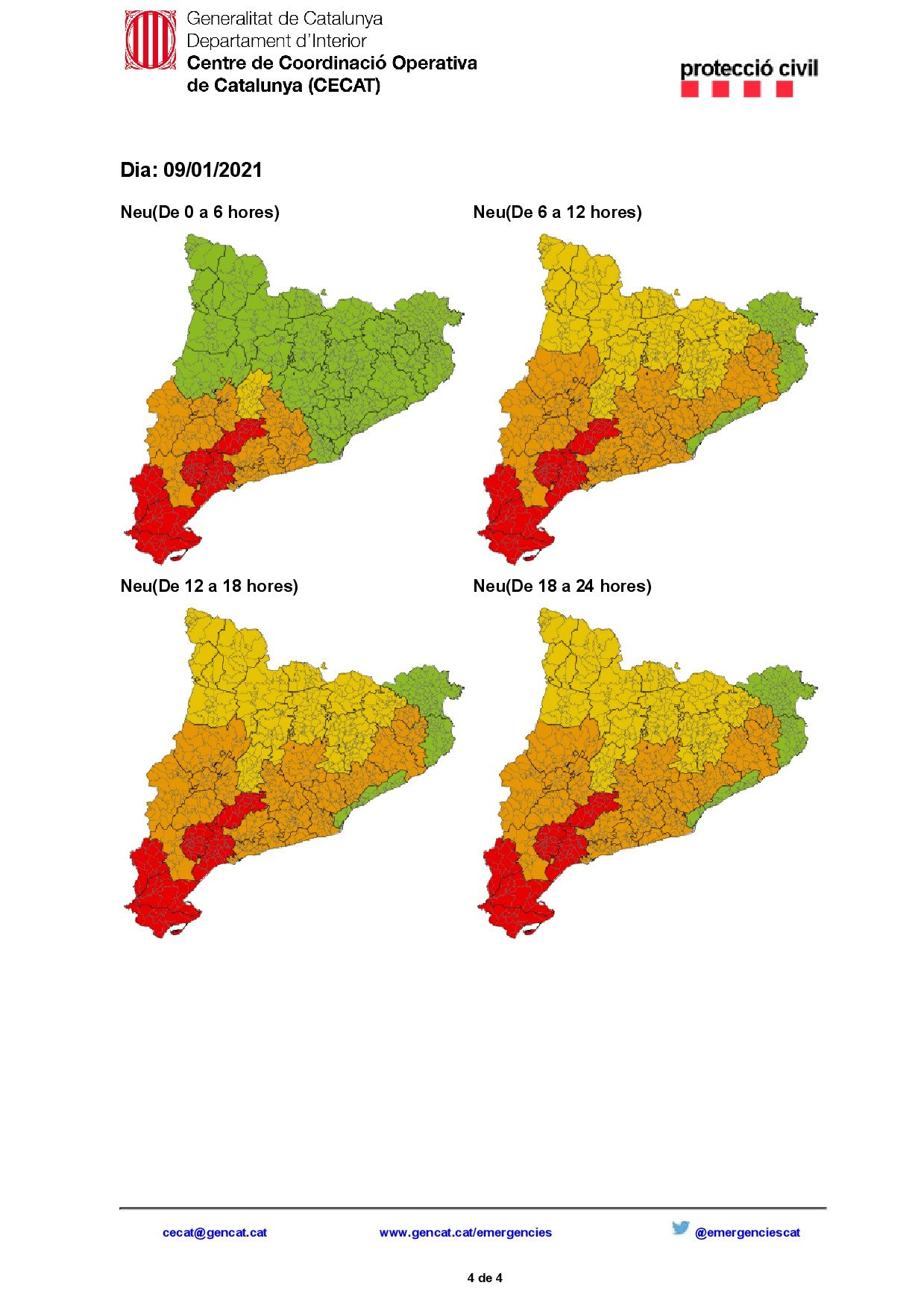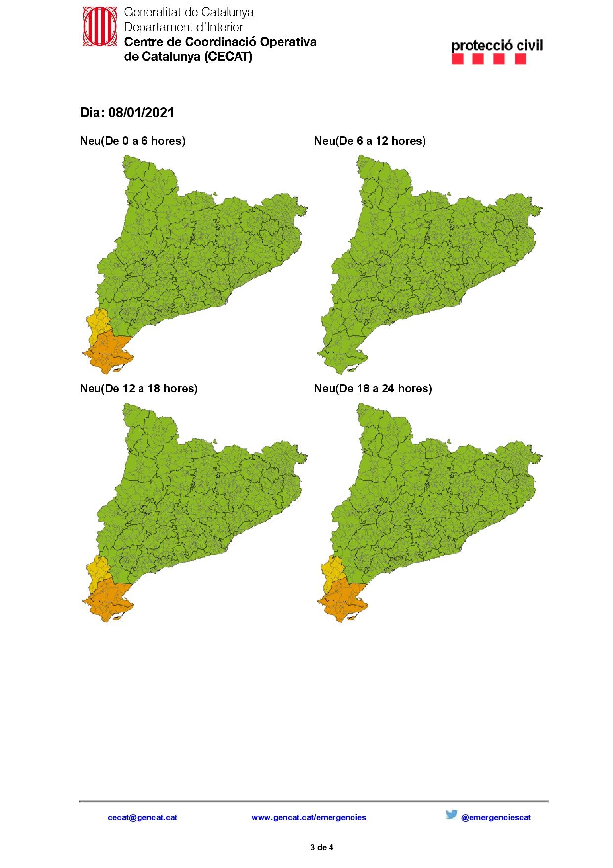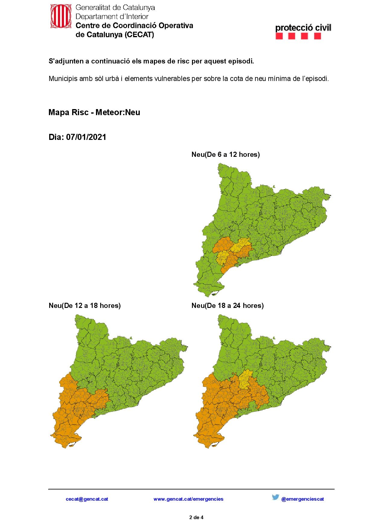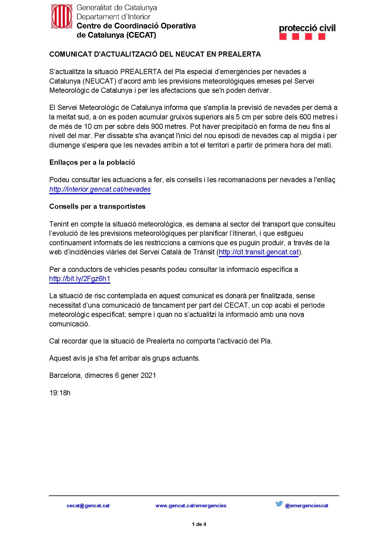 Por afectar a la principal ruta de comunicación entre España y el resto de Europa le hacemos llegar, en archivo adjunto, una notificación que se ha recibido del Centro de Coordinación Operativa de Cataluña (CECAT) en la que se actualiza la situación PREALERTA del Plan especial de emergencias por nevadas en Cataluña (NEUCAT) de acuerdo con las previsiones meteorológicas emitidas por su Servicio Meteorológico, el cual informa que se amplía la previsión de nevadas para hoy día 7 a la mitad sur, donde se pueden acumular espesores superiores a 5 cm por encima de los 600 metros y de más de 10 cm por encima de los 900 metros. Puede haber precipitación en forma de nieve hasta el nivel del mar. Para el sábado se ha avanzado el inicio del nuevo episodio de nevadas hacia el mediodía y para el domingo se espera que las nevadas lleguen a todo el territorio a partir de primera hora de la mañana.