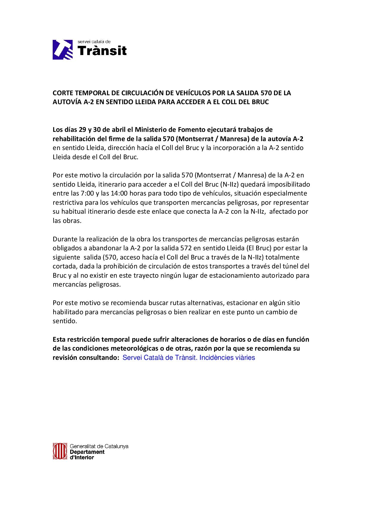 Desde el Servei Català de Trànsit nos envían la comunicación del corte temporal de circulación de vehículos por la salida 570 de la autovía A-2 en sentido Lleida para acceder a El Coll del Bruc, los días 29 y 30 de abril.