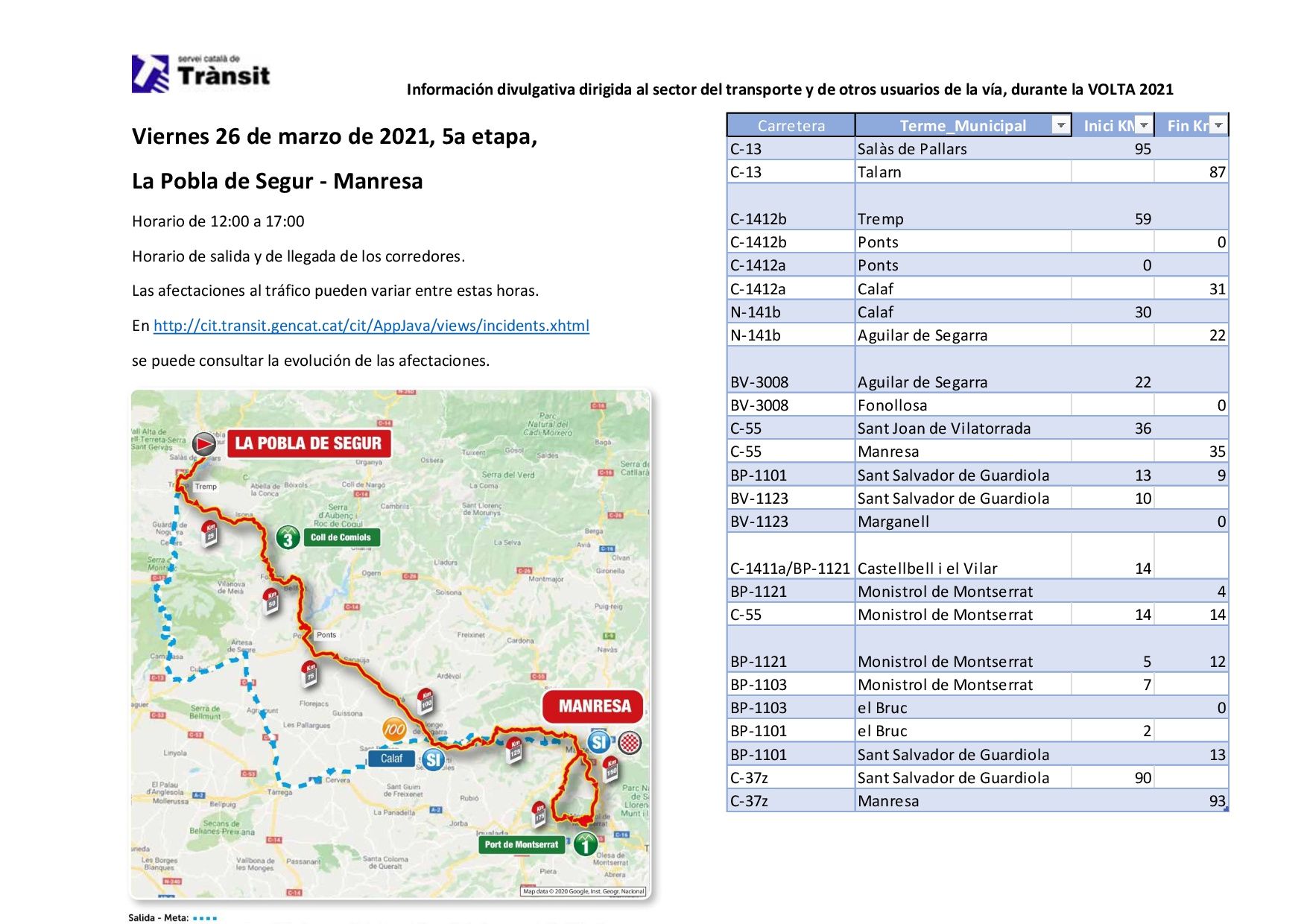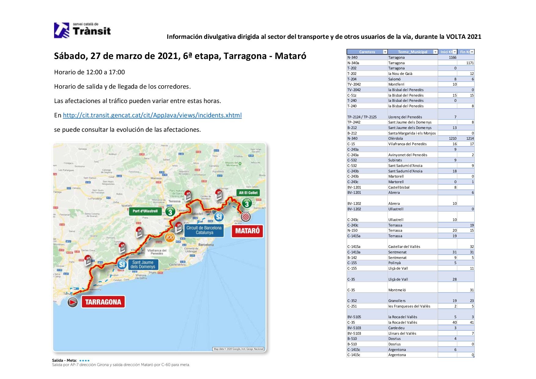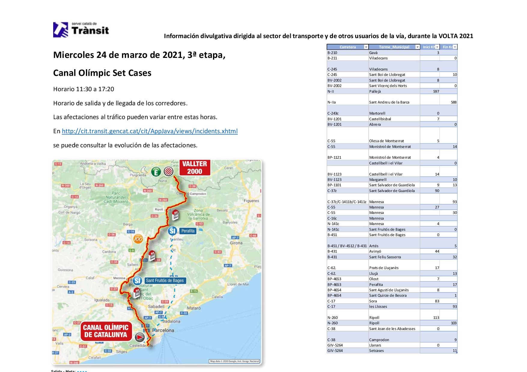 Para conocer mejor, cada día, el alcance de estas afectaciones, pueden consultar el enlace siguiente: http://cit.transit.gencat.cat/cit/AppJava/views/incidents.xhtml o tener información sobre las incidencias y cortes por la Volta Ciclista a Catalunya en la cuenta de tuiter @Transit.