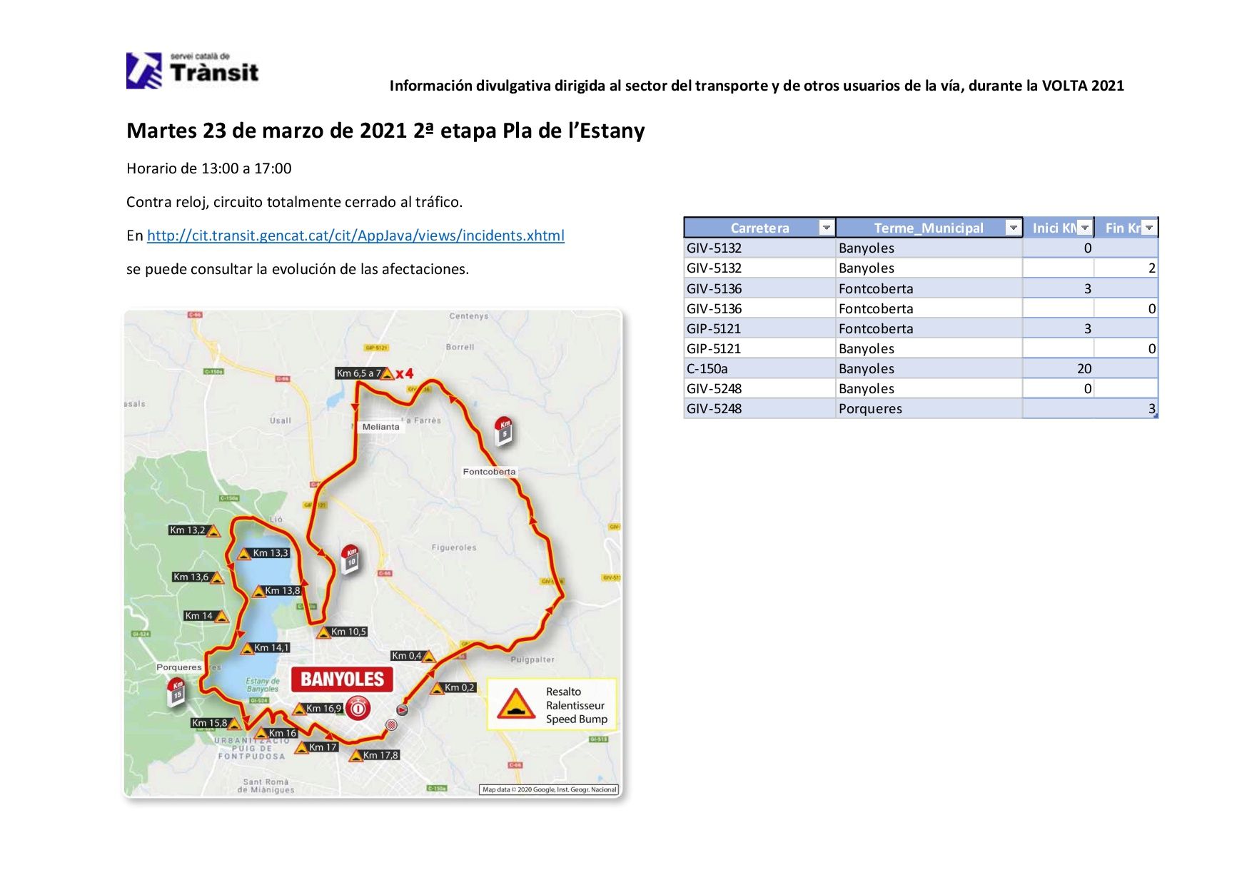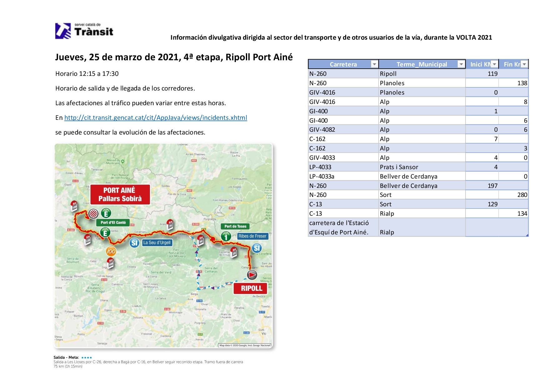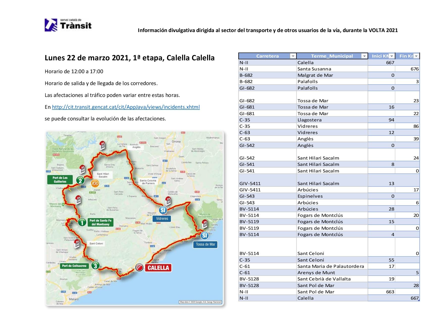 Para conocer mejor, cada día, el alcance de estas afectaciones, pueden consultar el enlace siguiente: http://cit.transit.gencat.cat/cit/AppJava/views/incidents.xhtml o tener información sobre las incidencias y cortes por la Volta Ciclista a Catalunya en la cuenta de tuiter @Transit.