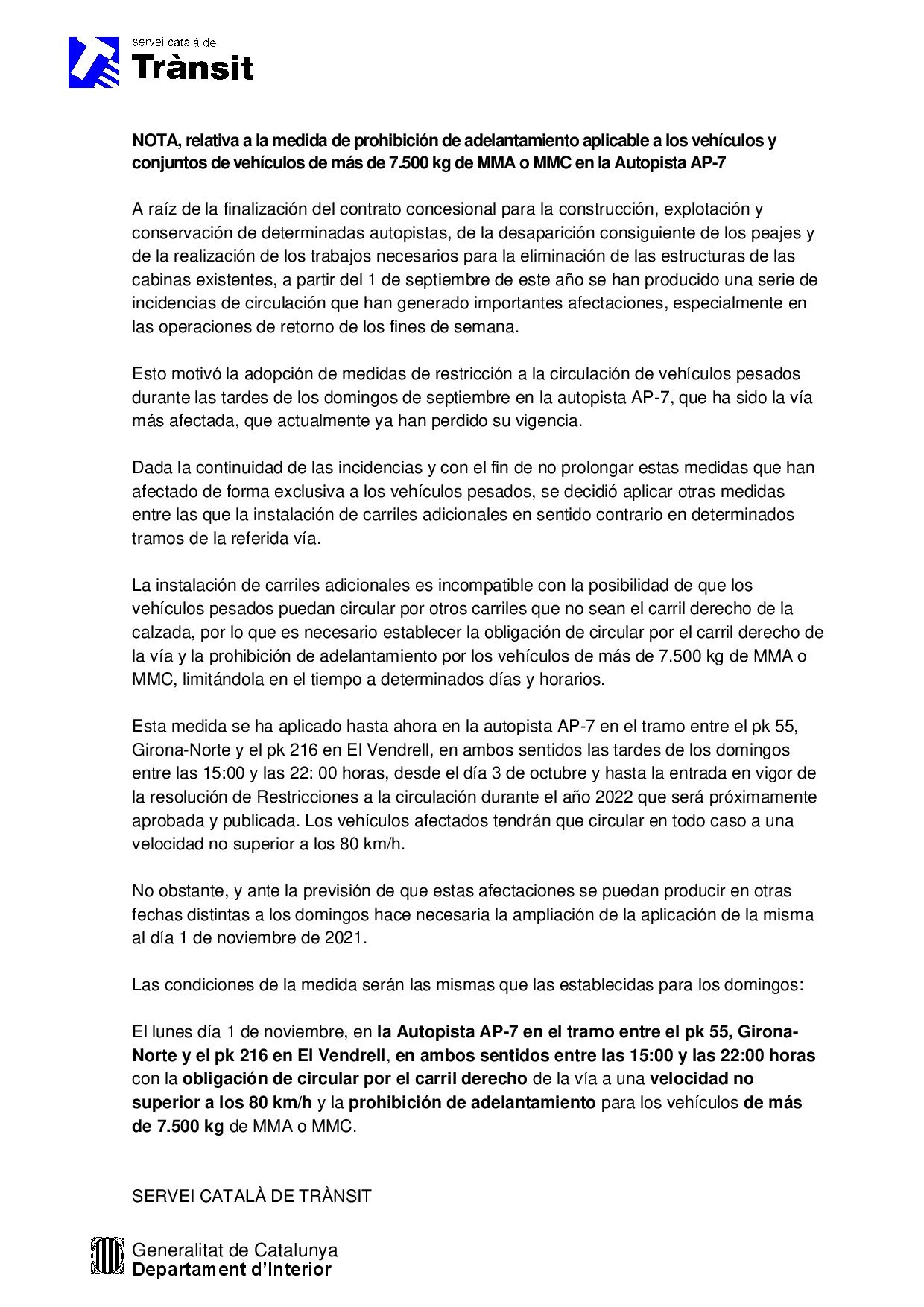 El Sevei de Transit de la Generalidad de Cataluña ha ampliado las prohibiciones de adelantar en la AP7, en el tramo entre Girona nord (Km 55) y El Vendrell (km 216), en ambos sentidos para los vehículos de más de 7,5 toneladas al día 1 de noviembre. Además, todos los vehículos deberán circular por el carril derecho a no más de 80 Km/h.