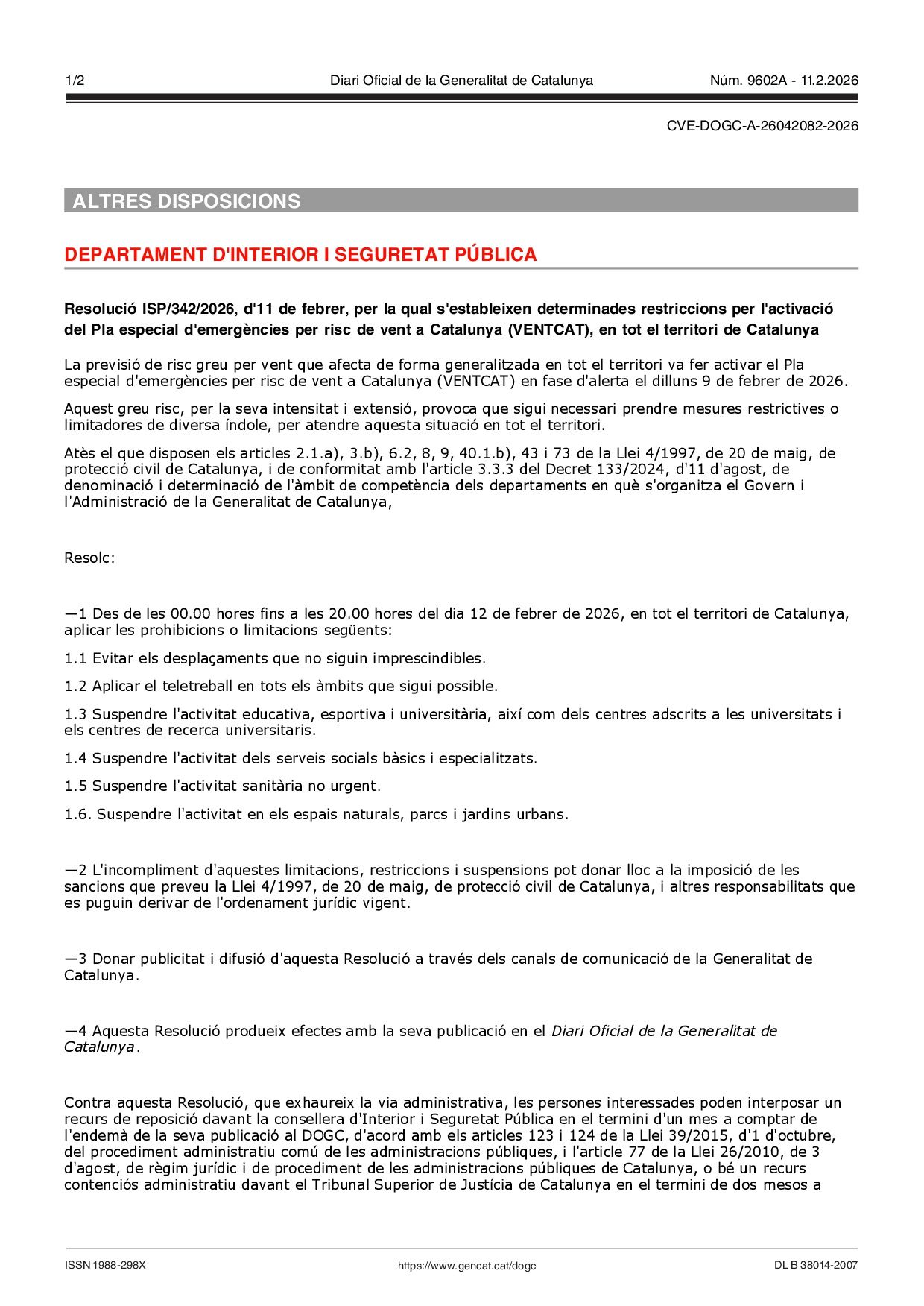 - Resolución ISP/342/2026, de 11 de febrero, por la que se establecen determinadas restricciones por la activación del Plan especial de emergencias por riesgo de viento en Cataluña (VENTCAT), en todo el territorio de Cataluña.