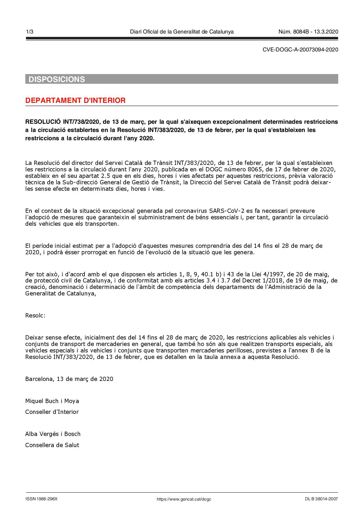 La decisión se ha tomado en el marco de la situación excepcional generada por el coronavirus SARS-CoV-2 en la que es necesario predecir la adopción de medidas que garanticen el suministro de mercancías esenciales y, por tanto, garanticen la circulación de los vehículos que los transportan.