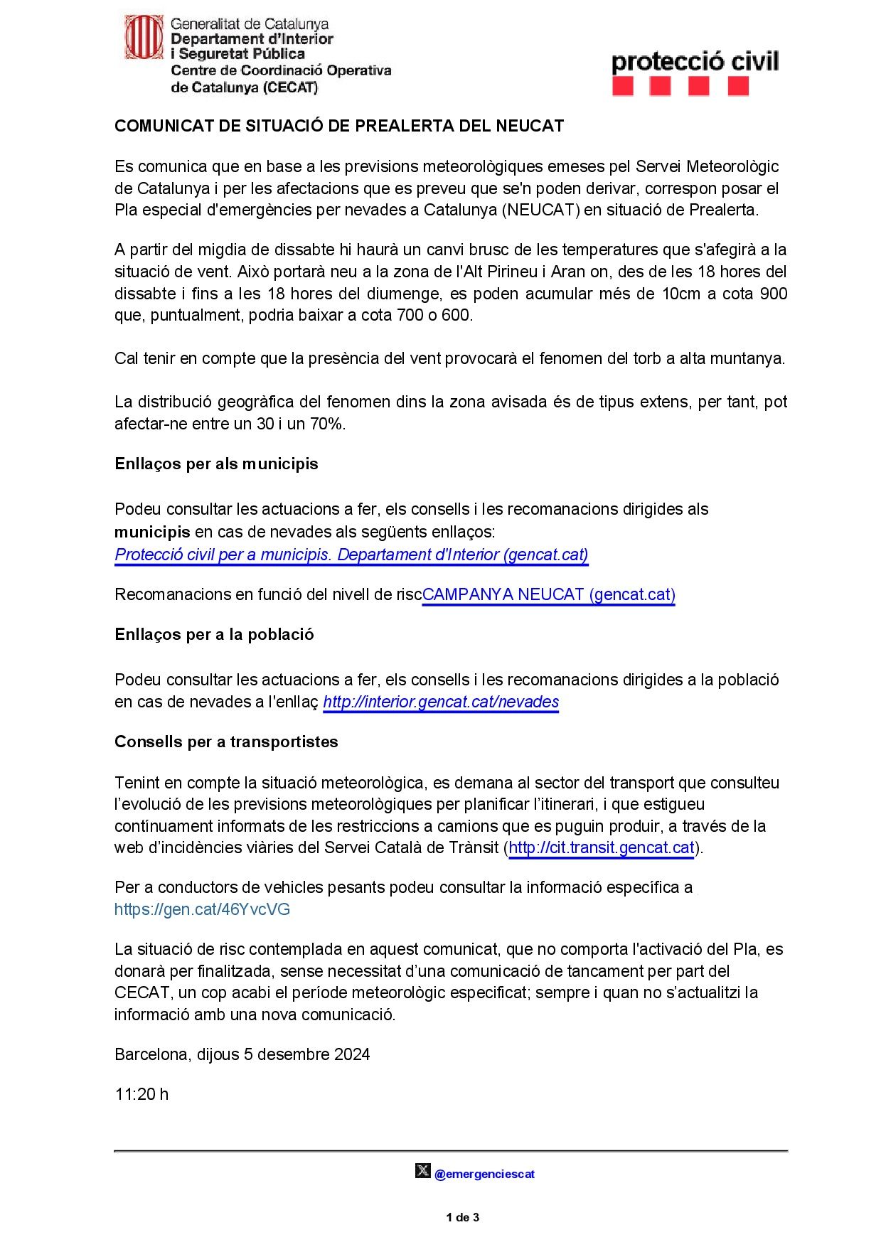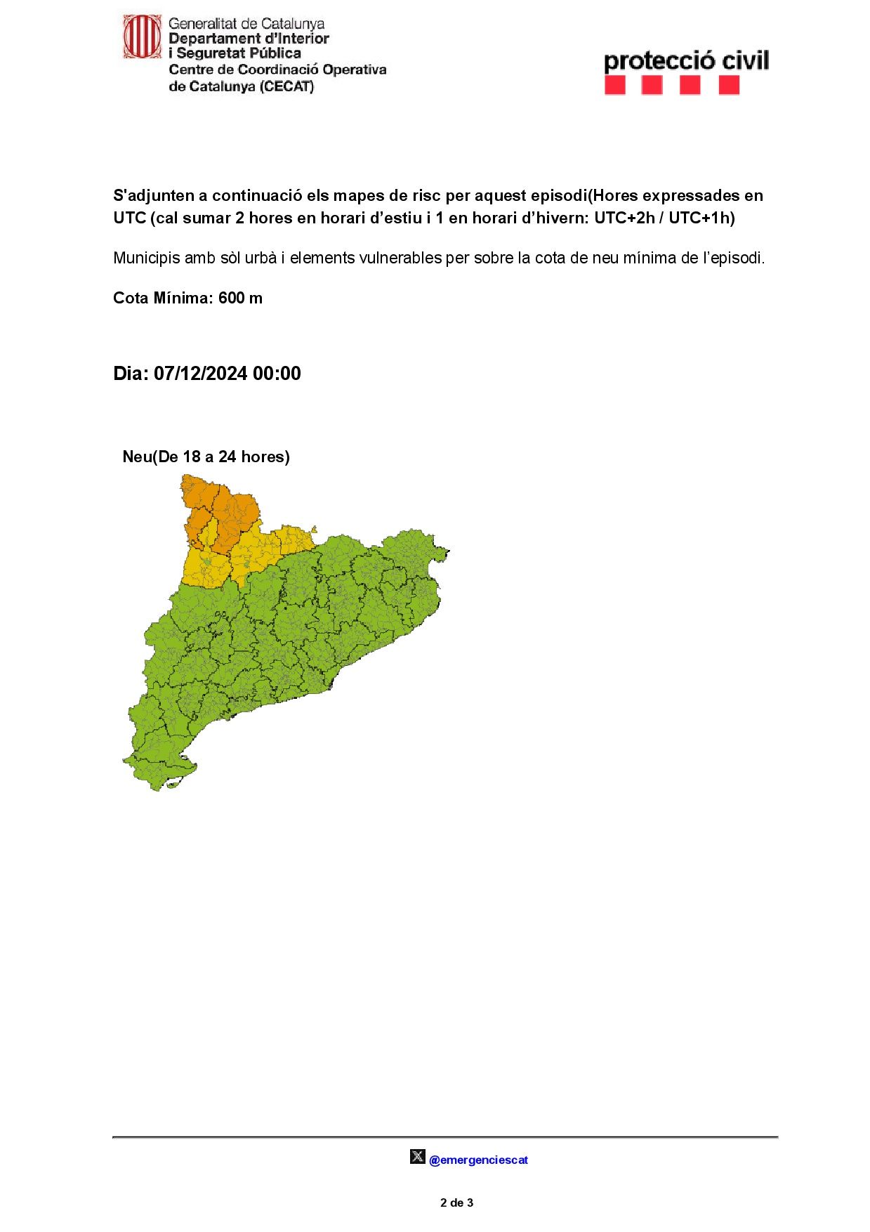 En el archivo adjunto puede encontrar el aviso emitido por el Centro de Coordinación Operativa de Cataluña en relación con los fenómenos atmosféricos adversos que se prevén para los próximos días.