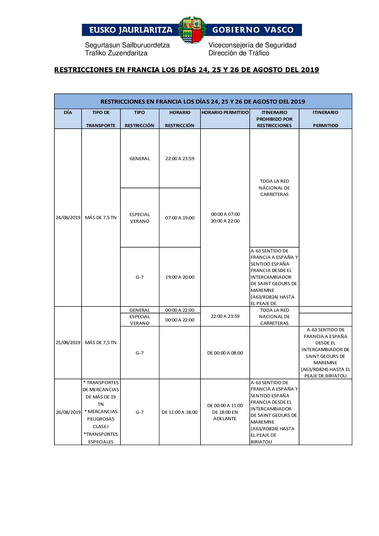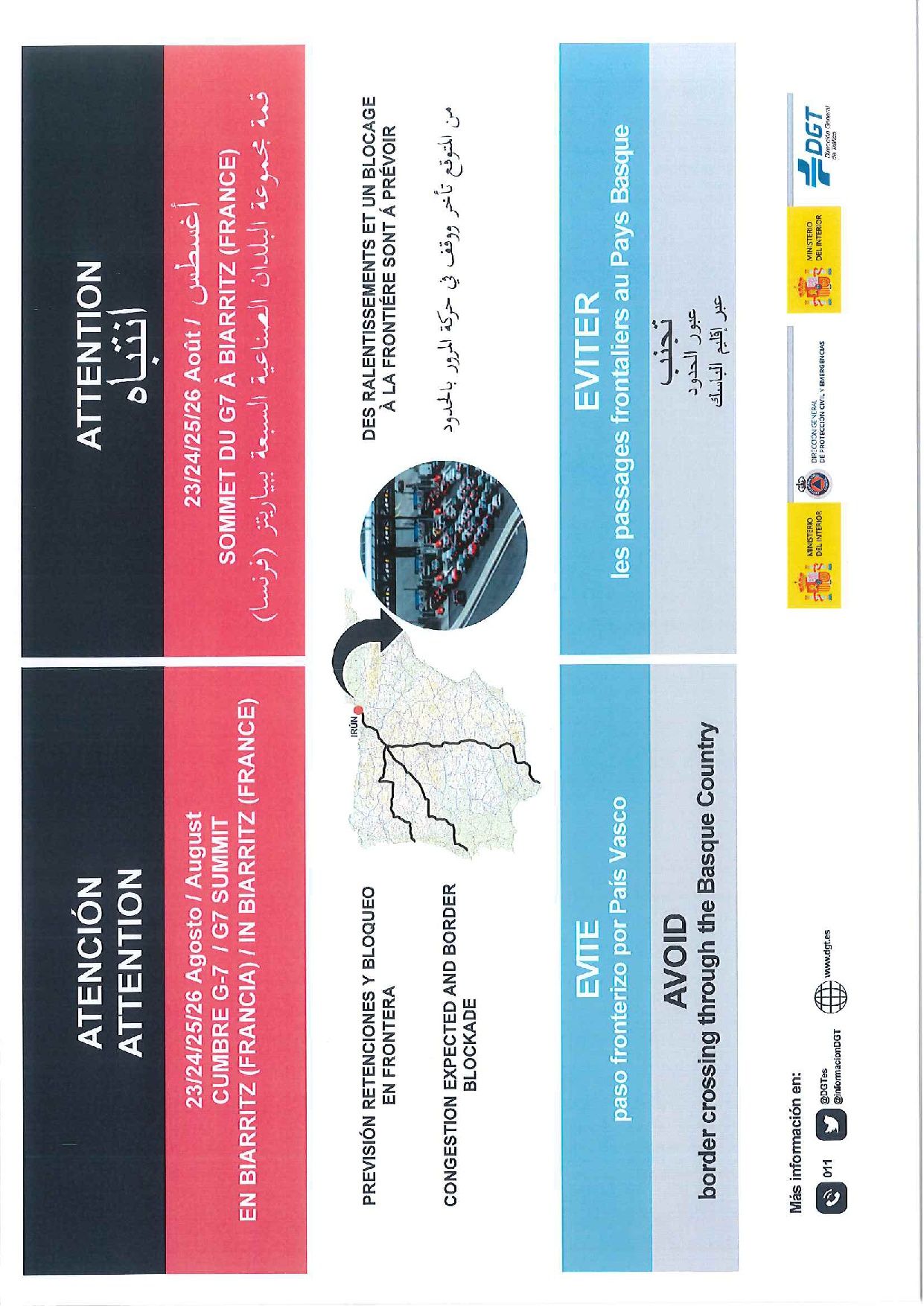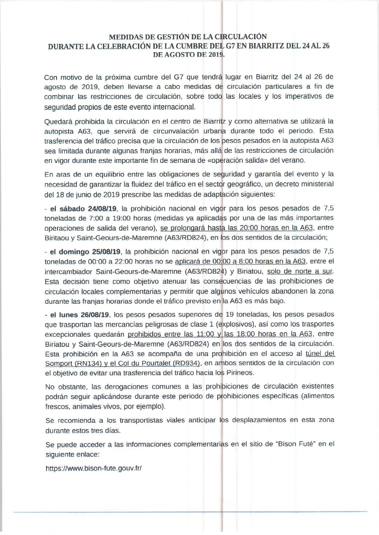 Siguiendo la información remitida en el Flash Informativo número 56.19 sobre la celebración de la Cumbre del G7 en Biarritz y sus consecuencias para el tráfico, ponemos en su conocimiento, esta vez, la documentación complementaria que nos ha hecho llegar la Dirección General de Tráfico así como el Gobierno Vasco.