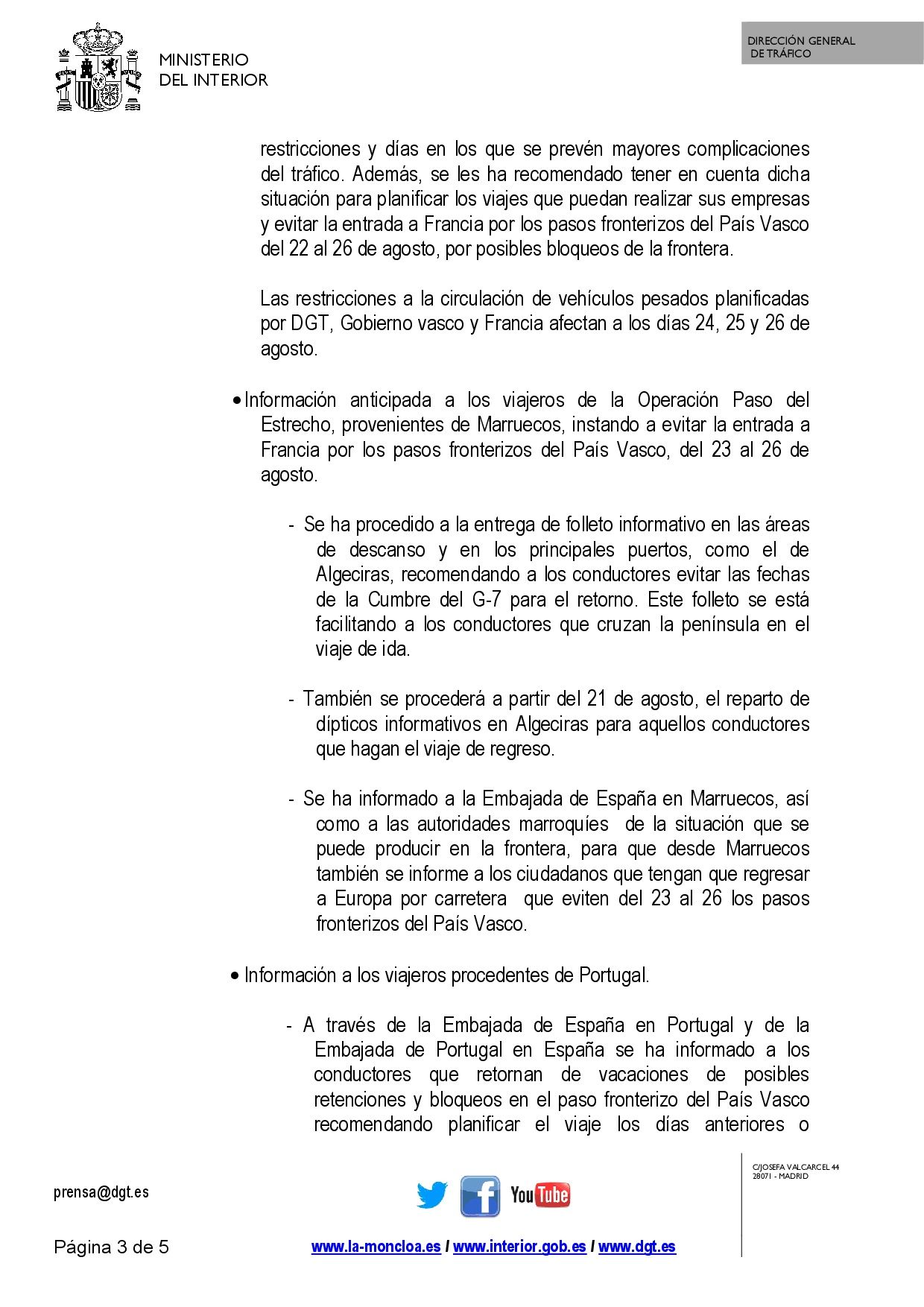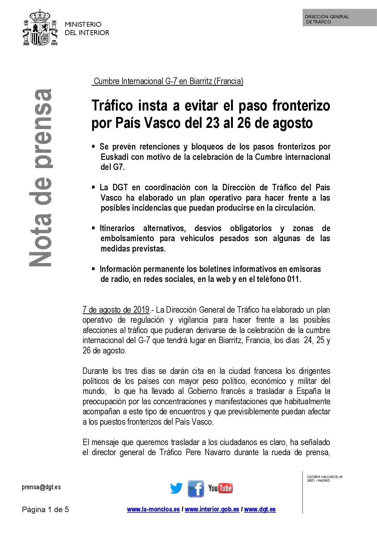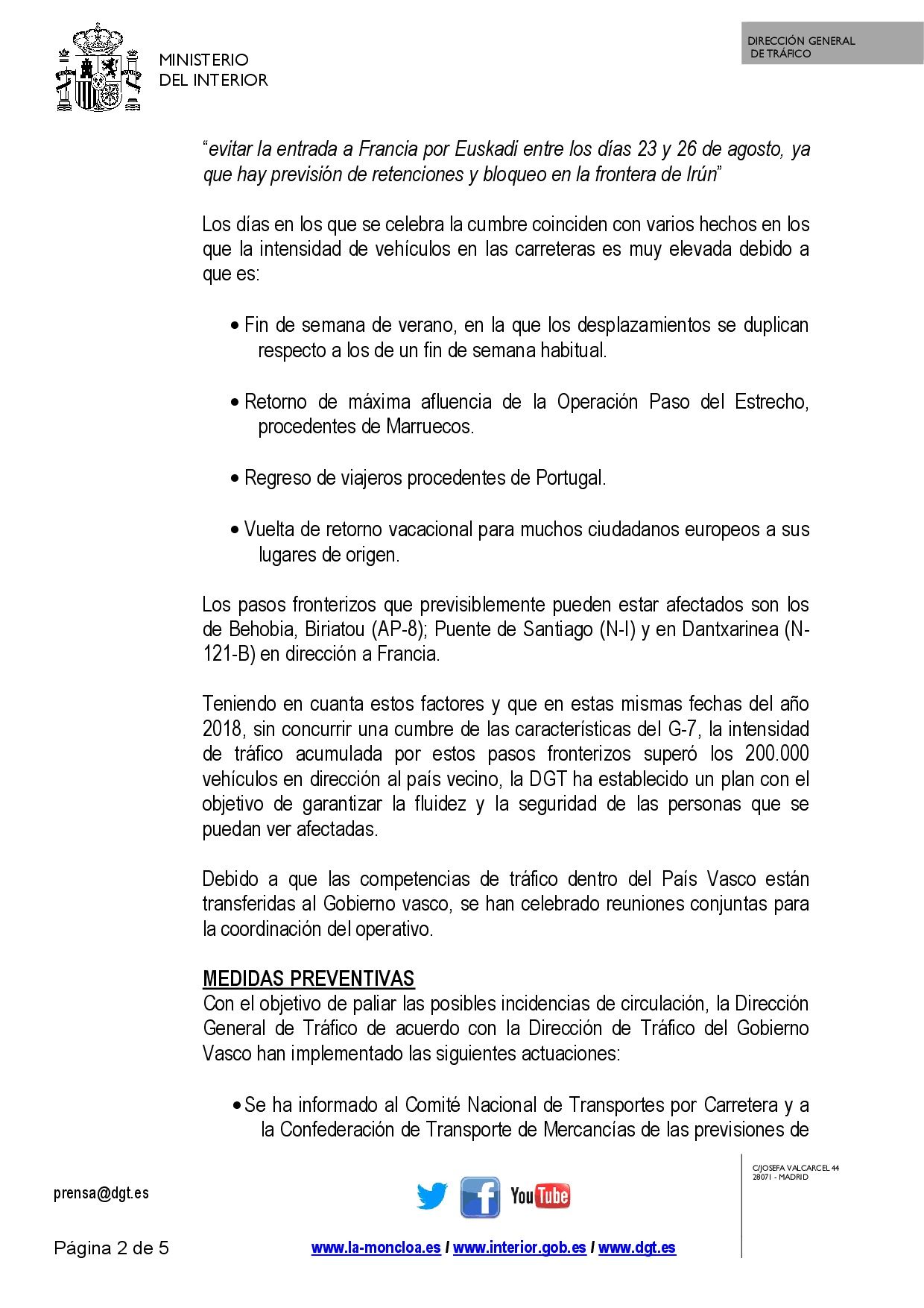 Como continuación y complemento de las informaciones que ya le enviamos sobre este mismo tema los días 24 y 29 de julio, tenemos que comunicarle que ha tenido lugar en la DGT una rueda de prensa para informar sobre el impacto que tendrá la celebración de la cumbre internacional del G7 en Biarritz en lo que a tráfico se refiere.