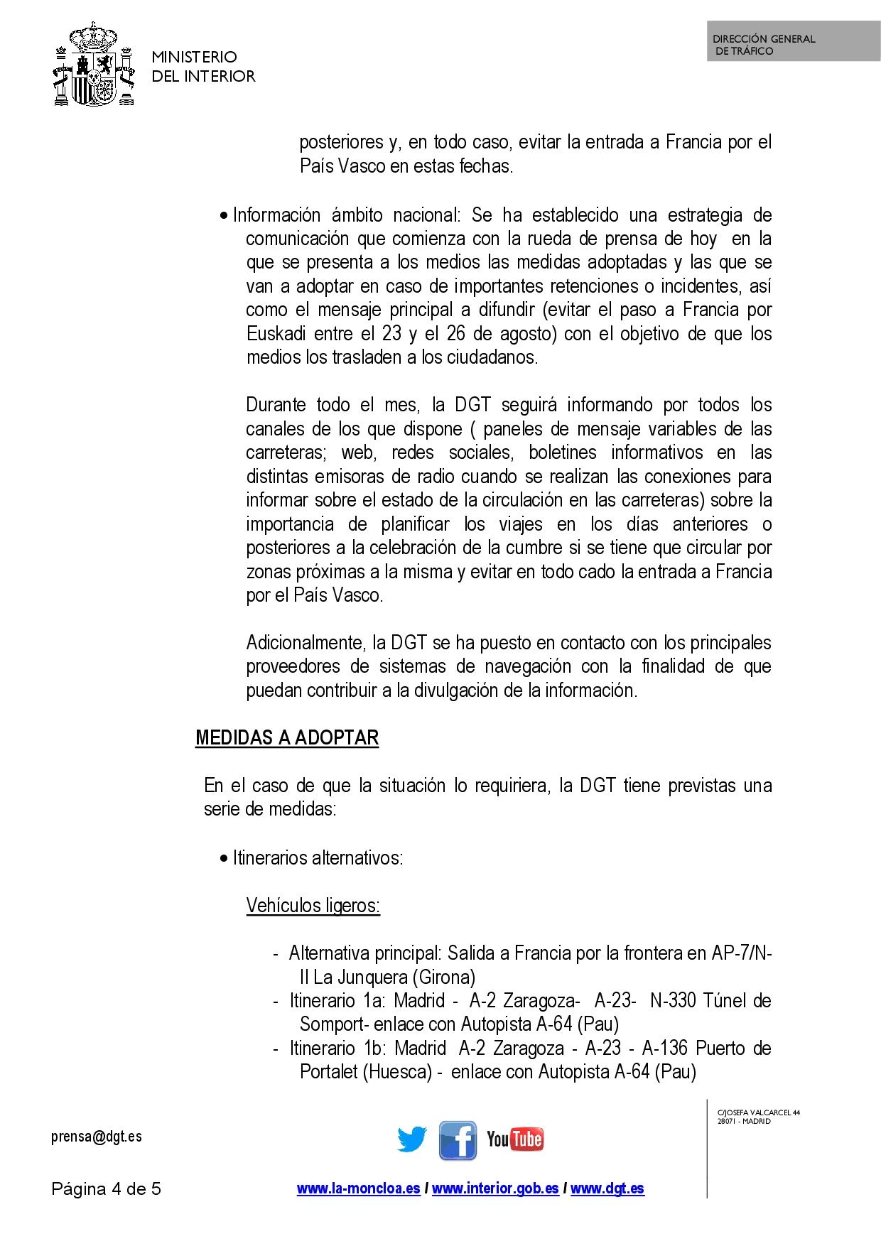 Tal y como se le había solicitado al Director General de Tráfico, desde su oficina se ha puesto en conocimiento la información sobre los itinerarios alternativos con los que trabajarán en la DGT los días de la cumbre a fin de evitar colapsar los accesos fronterizos del lado de Irún. Información que puede encontrar usted en los archivos anexos así como el propio contenido de la nota de prensa hecha pública desde la DGT.