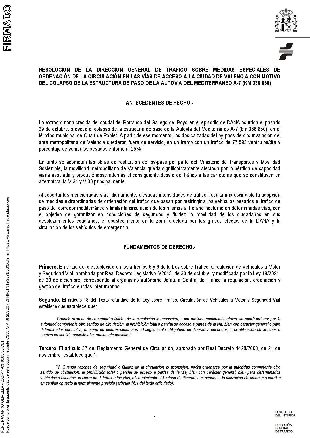 Ante las terribles consecuencias de pérdidas humanas y daños en las infraestructuras, sin precedente en nuestro país, y ante los problemas de movilidad que se están generando y que previsiblemente aumentarán en el comienzo de semana, la Dirección General de Tráfico ha emitido una resolución de medidas extraordinarias de ordenación del tráfico para minimizar las posibles afecciones a la movilidad que se puedan producir en el área metropolitana de Valencia, que les hacemos llegar en archivo adjunto. También puede encontrar en archivo adjunto la Nota de Prensa publicada por la Dirección General de Tráfico con el mismo asunto.
