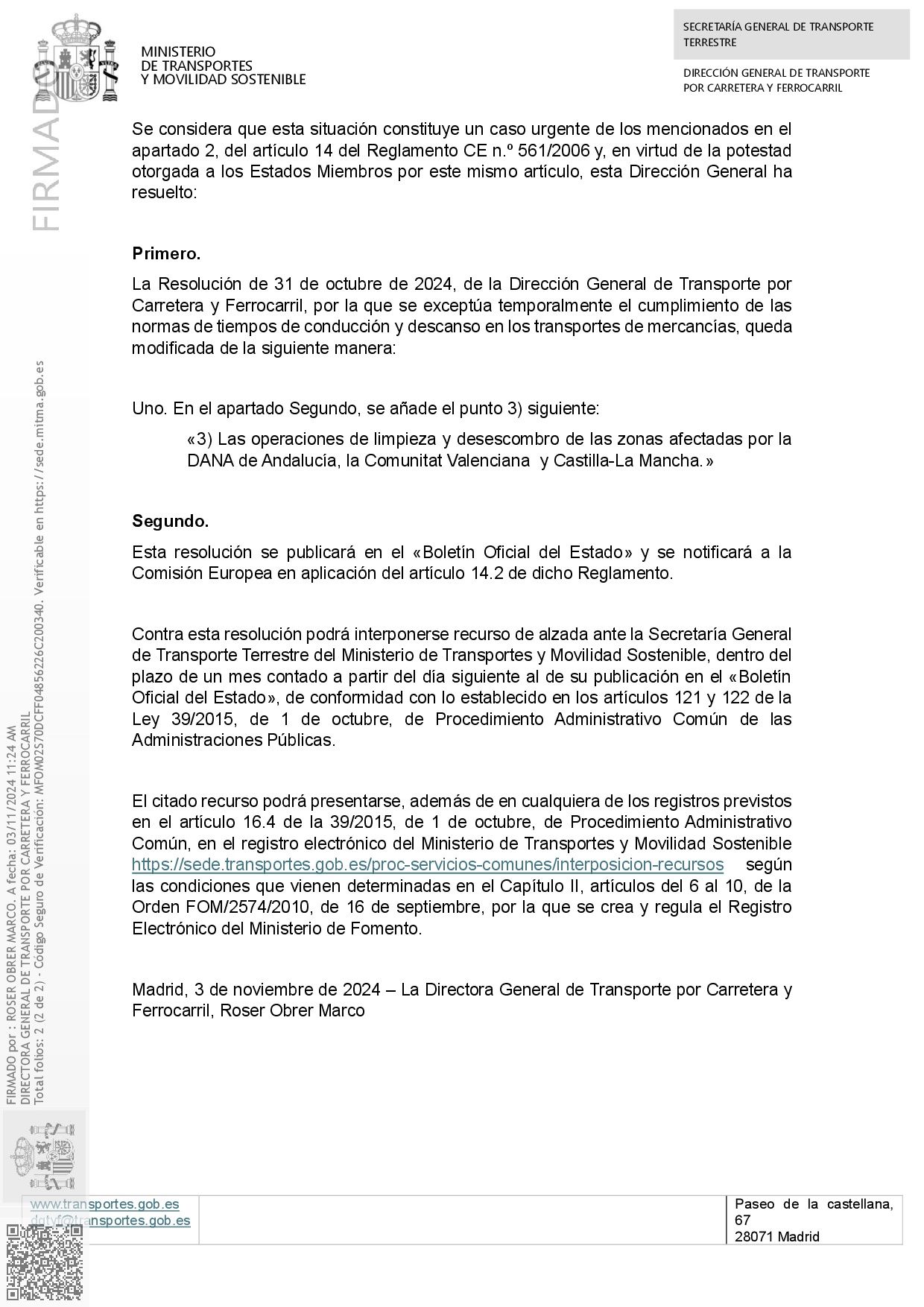 Así mismo, adjuntamos la Resolución de 3 de noviembre de 2024, de la Dirección General de Transporte por Carretera y Ferrocarril, por la que se modifica la Resolución de 31 de octubre, por la que se exceptúa temporalmente el cumplimiento de las normas de tiempos de conducción y descanso en los transportes de mercancías.