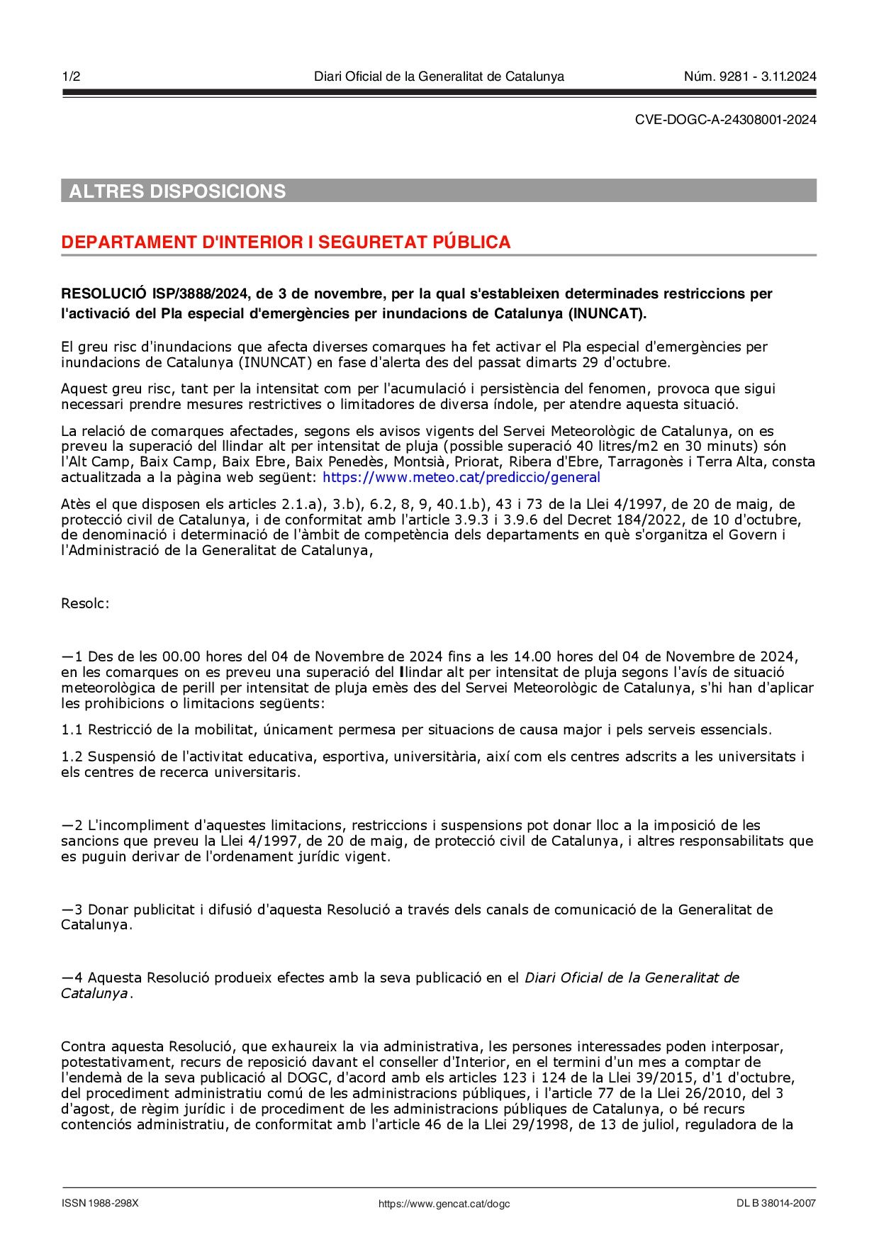 Por otro lado, debido al grave riesgo de inundaciones que afecta a diversas comarcas catalanas, el Departamento de Interior y Seguridad Pública ha publicado la RESOLUCIÓN ISP/3888/2024, de 3 de noviembre, en la que se establecen determinadas restricciones por la activación del Plan especial de emergencias por inundaciones de Cataluña (INUNCAT), que se adjunta.
