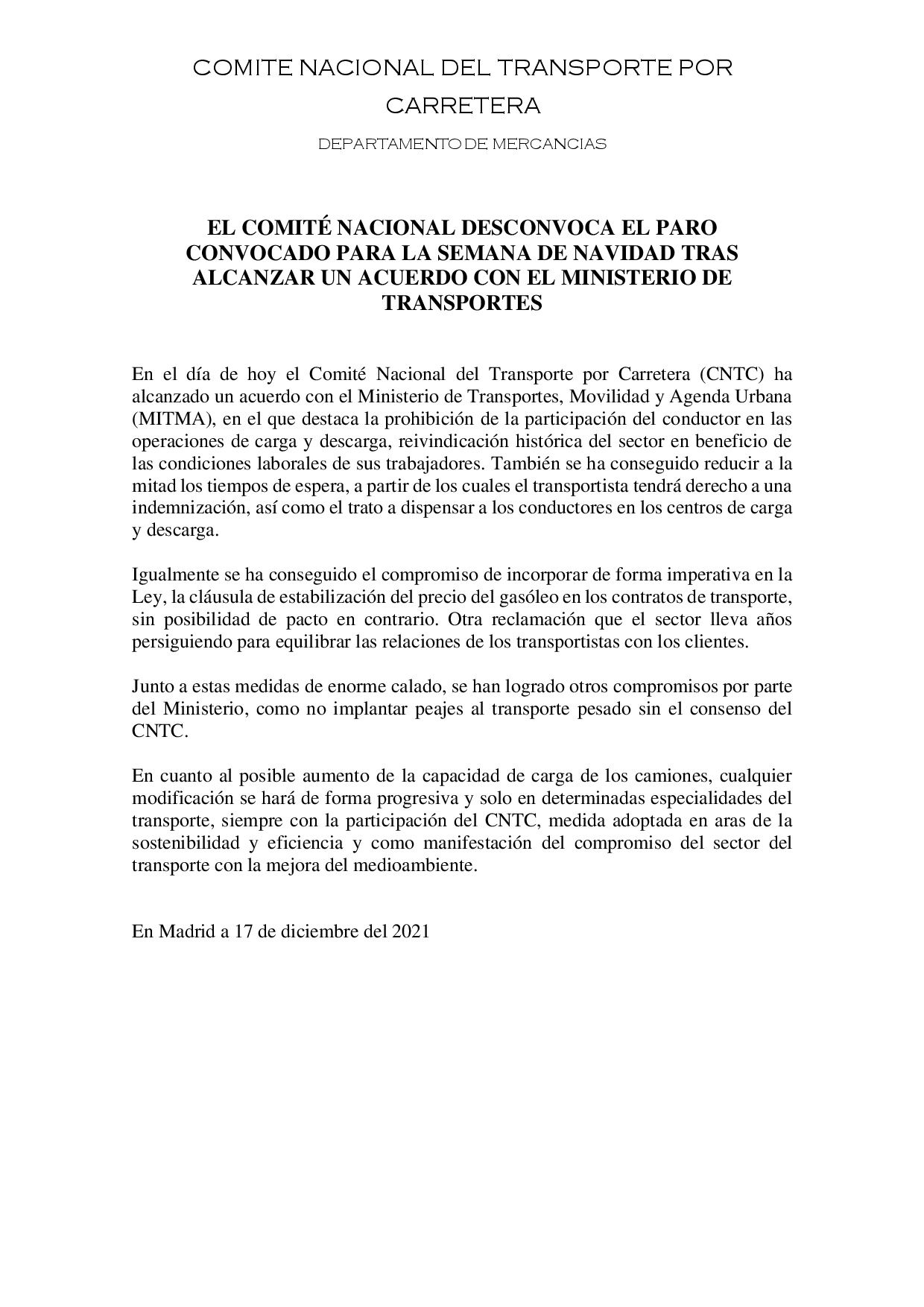 Nos complace enormemente poder informarle de que, tras más de once horas en el Ministerio de Transportes, se ha alcanzado un acuerdo que será formalizado mañana y que permite que el Comité Nacional de Transporte por Carretera anuncie la desconvocatoria del paro sectorial que iniciaba el lunes próximo.
