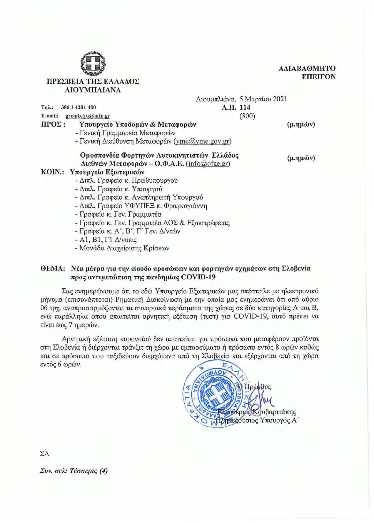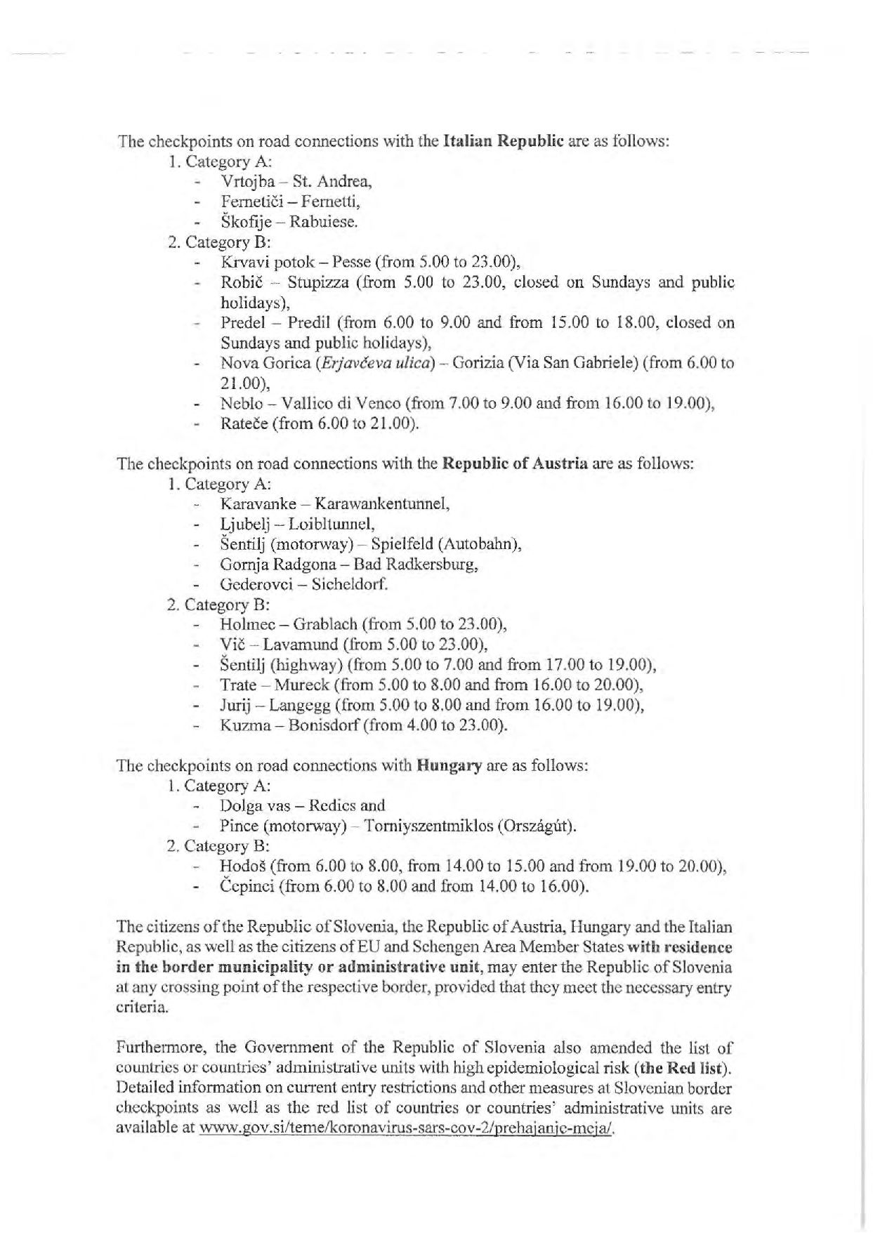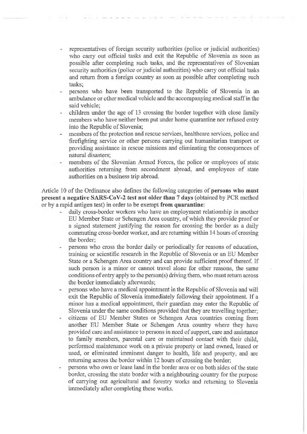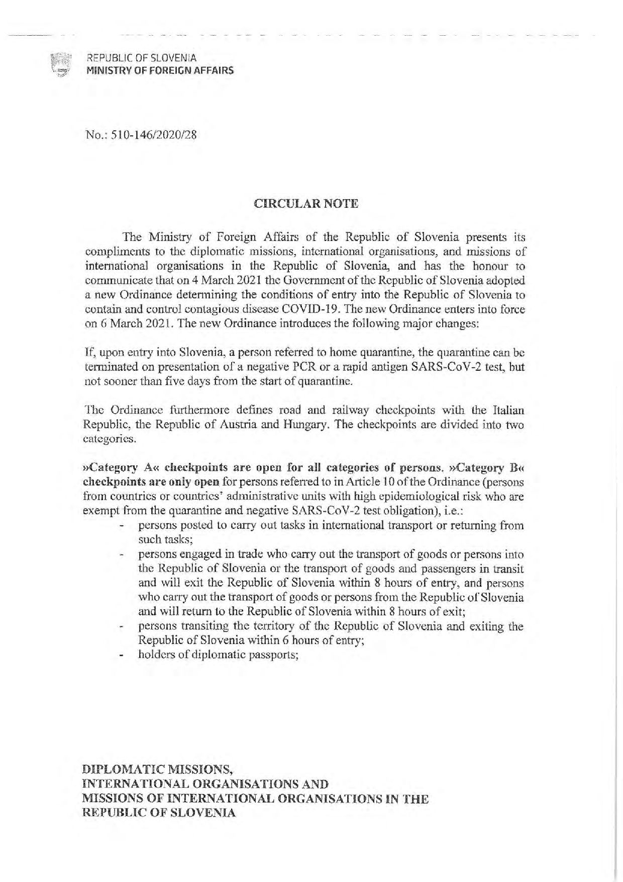 El 4 de marzo de 2021, el Gobierno de la República de Eslovenia adoptó una nueva ordenanza que determina las condiciones de entrada para contener y controlar la enfermedad COVID-19. La nueva ordenanza entró en vigor el 6 de marzo de 2021 e introduce los siguientes cambios importantes: