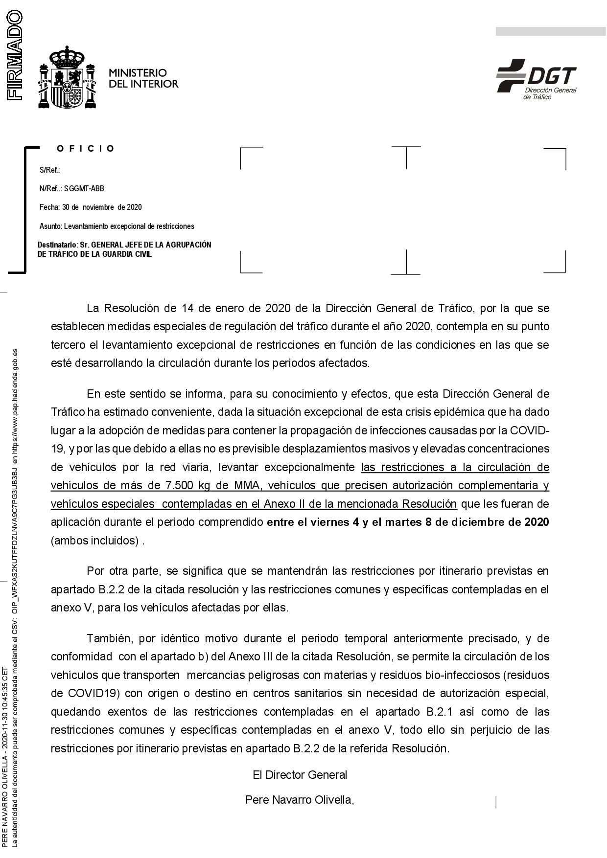 A continuación adjuntamos Nota informativa del Ministerio de Interior y de la DGT donde se indica que se ha estimado conveniente, dada la situación excepcional de esta crisis epidémica, y por las que debido a ellas no es previsible desplazamientos masivos y elevadas concentraciones de vehículos por la red viaria, levantar excepcionalmente las restricciones a la circulación de vehículos de más de 7.500 kg de MMA, vehículos que precisen autorización complementaria y vehículos especiales contempladas en el Anexo II de La Resolución de 14 de enero de 2020 de la Dirección General de Tráfico que les fueran de aplicación durante el periodo comprendido entre el viernes 4 y el martes 8 de diciembre de 2020.