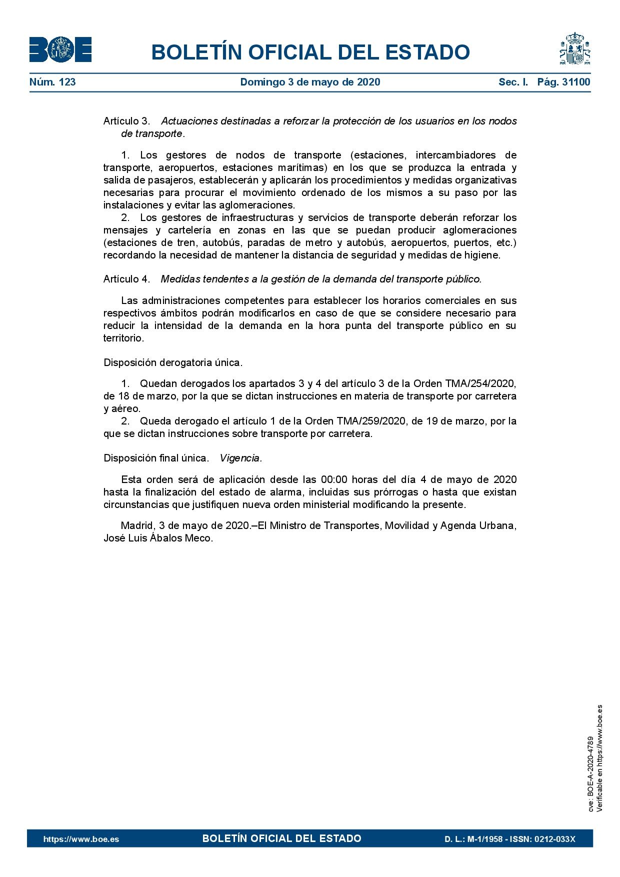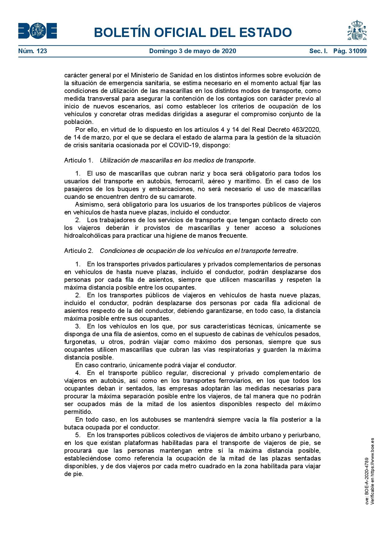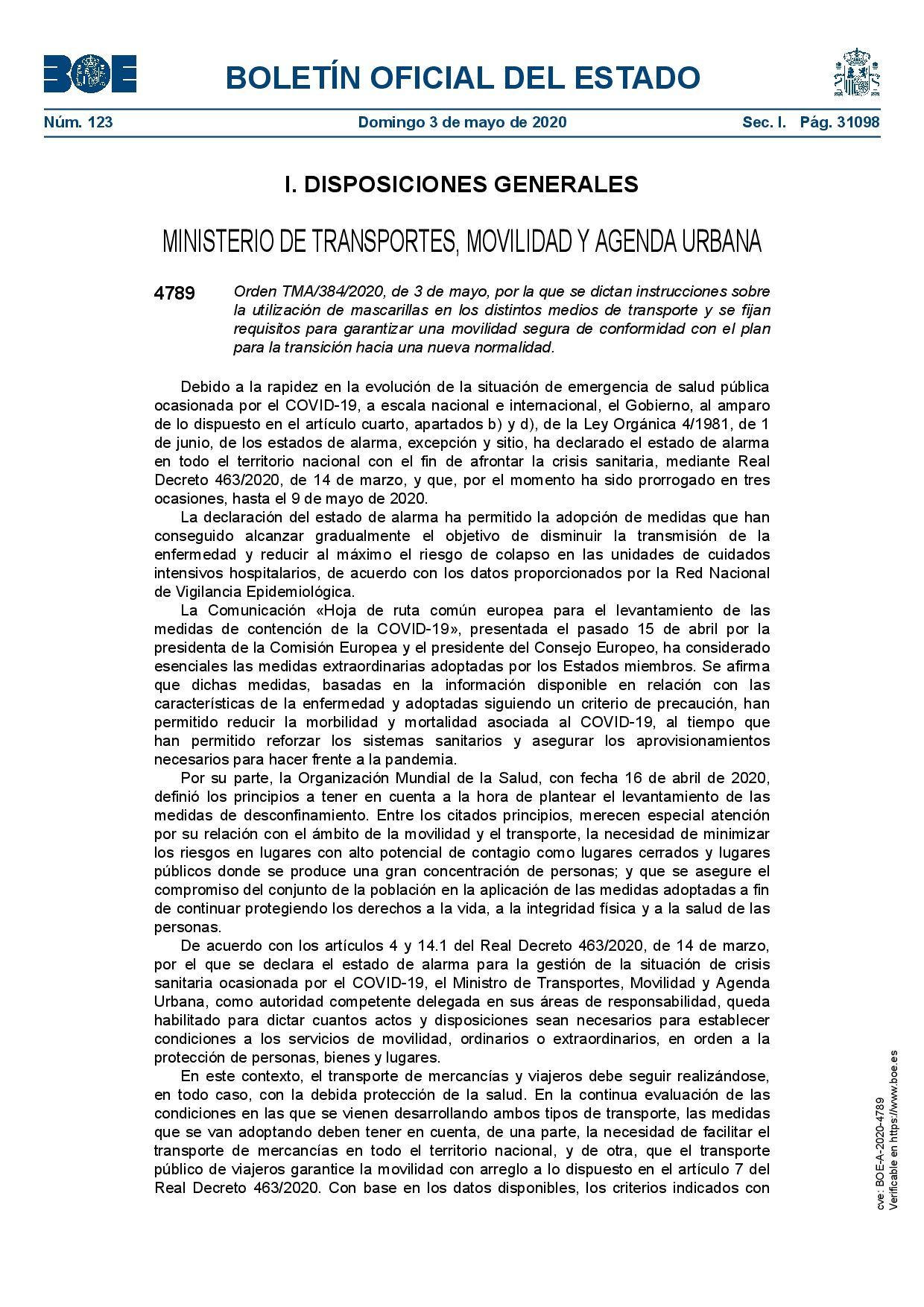 Por su inmediatez y alcance le remitimos la recentísima Orden TMA/384/2020, de 3 de mayo, por la que se dictan instrucciones sobre la utilización de mascarillas en los distintos medios de transporte y se fijan requisitos para garantizar una movilidad segura, en la cual literalmente puede leerse:
