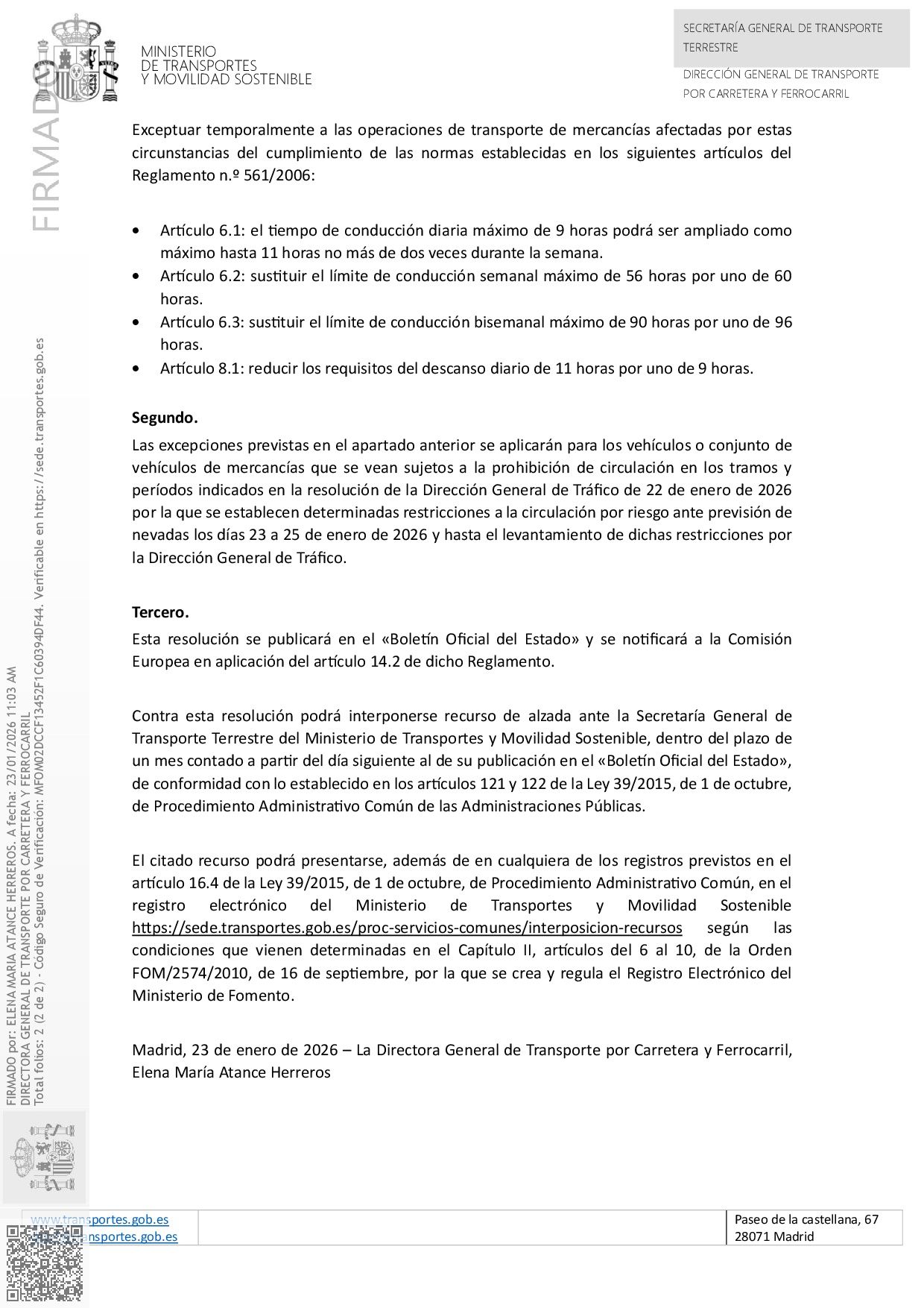 Se adjunta la Resolución de 23 de enero de 2026, de la Dirección General de Transporte por Carretera y Ferrocarril, por la que se exceptúa temporalmente el cumplimiento de las normas de tiempos de conducción y descanso para su conocimiento. Se ha enviado para su publicación en el Boletín Oficial del Estado en los próximos días.
