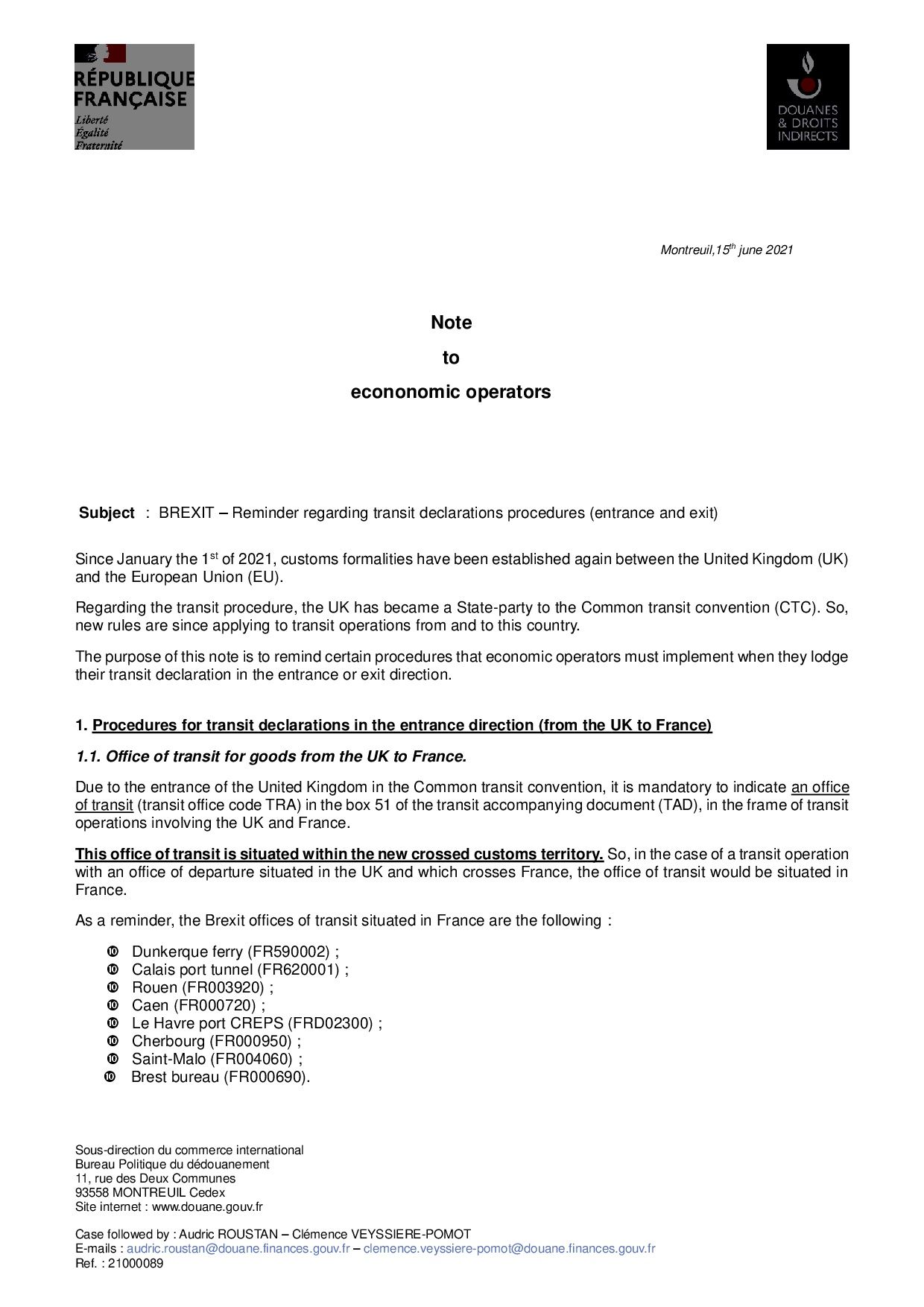 La presente nota adjunta tiene por objeto recordar ciertos procedimientos que los operadores económicos deben implementar cuando presentan su declaración de tránsito en el sentido de entrada o salida.