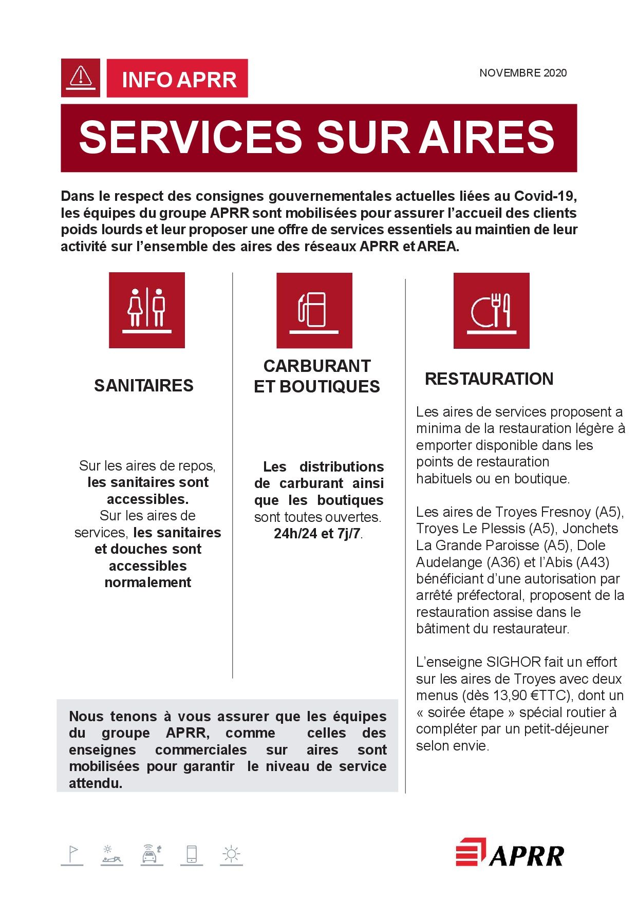 Todas las áreas de servicio y descanso permanecen abiertas 7d / 24h para servicios esenciales (comida para llevar, combustible, duchas y sanitarios).