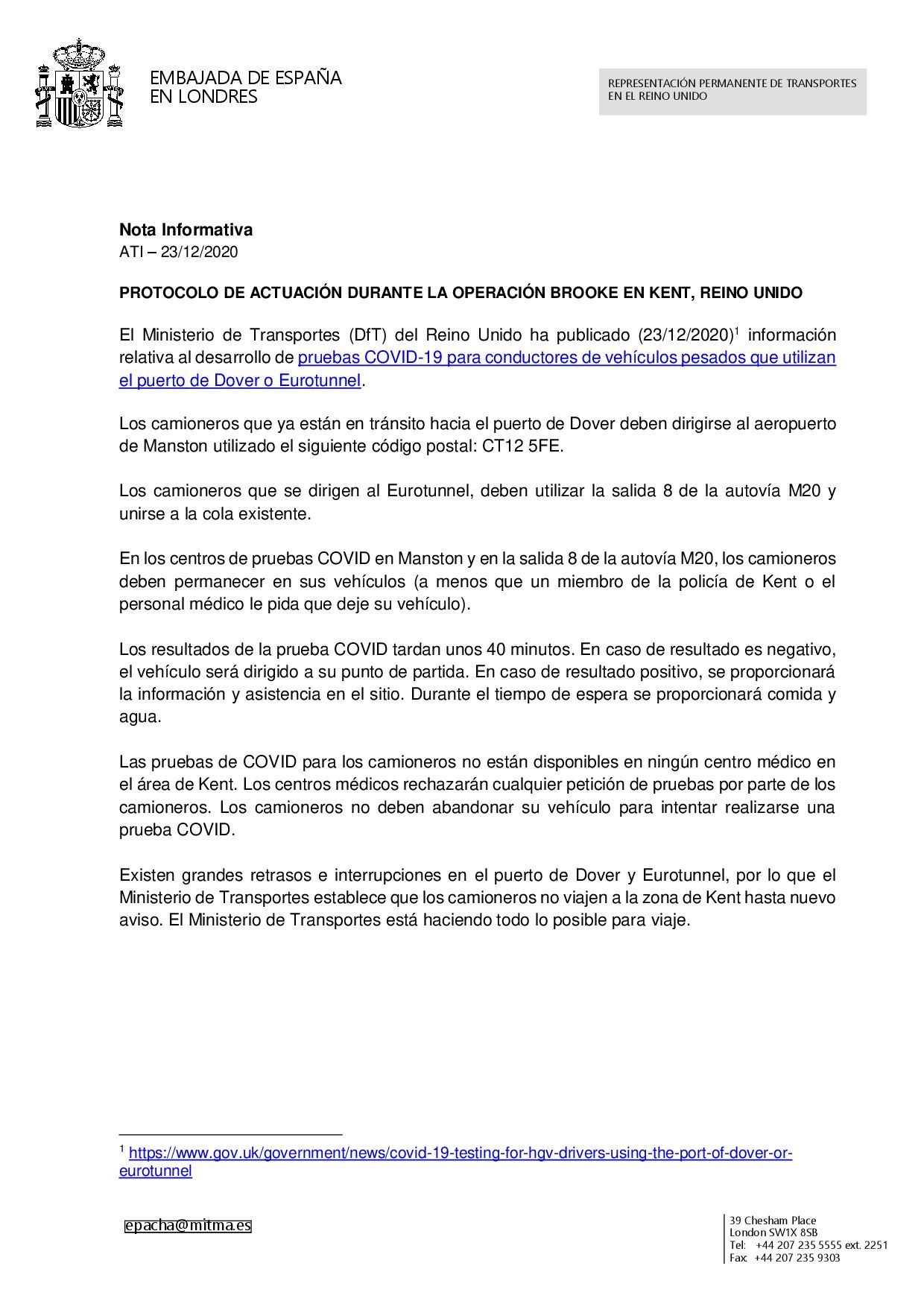Por otro lado, el Ministerio de Transportes ha publicado una nota informativa (se adjunta como pdf a este email) sobre el protocolo de actuación sobre desarrollo de pruebas COVID-19 para conductores de vehículos pesados que utilizan el puerto de Dover o Eurotúnel que acaba de publicar el Ministerio de Transportes (DfT) del Reino Unido, elaborada por la Representación Permanente de Transportes en el Reino Unido, Embajada de España en Londres.