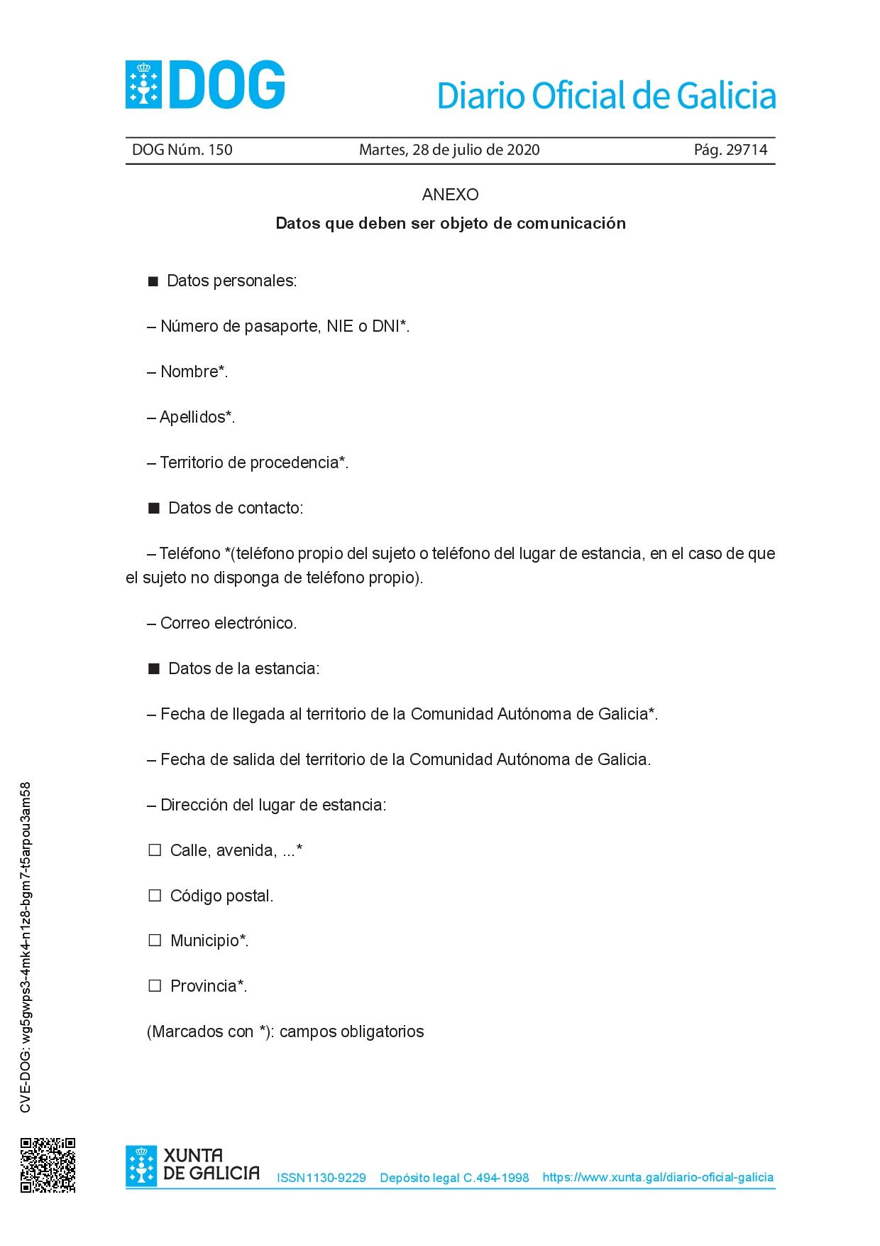 - Dentro de un plazo máximo de 24 horas desde su llegada a la Comunidad Autónoma de Galicia, dichas personas deberán comunicar los datos de contacto y estancia en la Comunidad Autónoma de Galicia que se incluyen en el anexo. Para hacerlo, deben completar el formulario disponible en el siguiente enlace