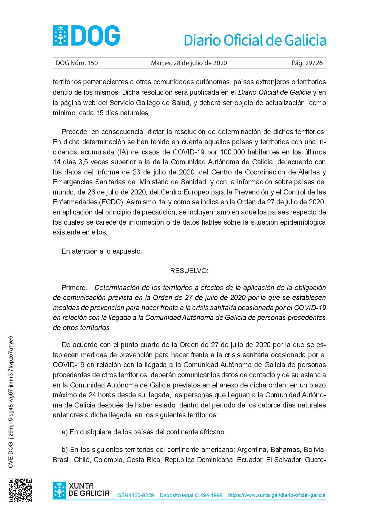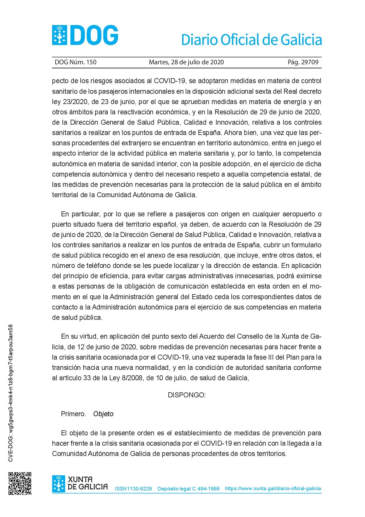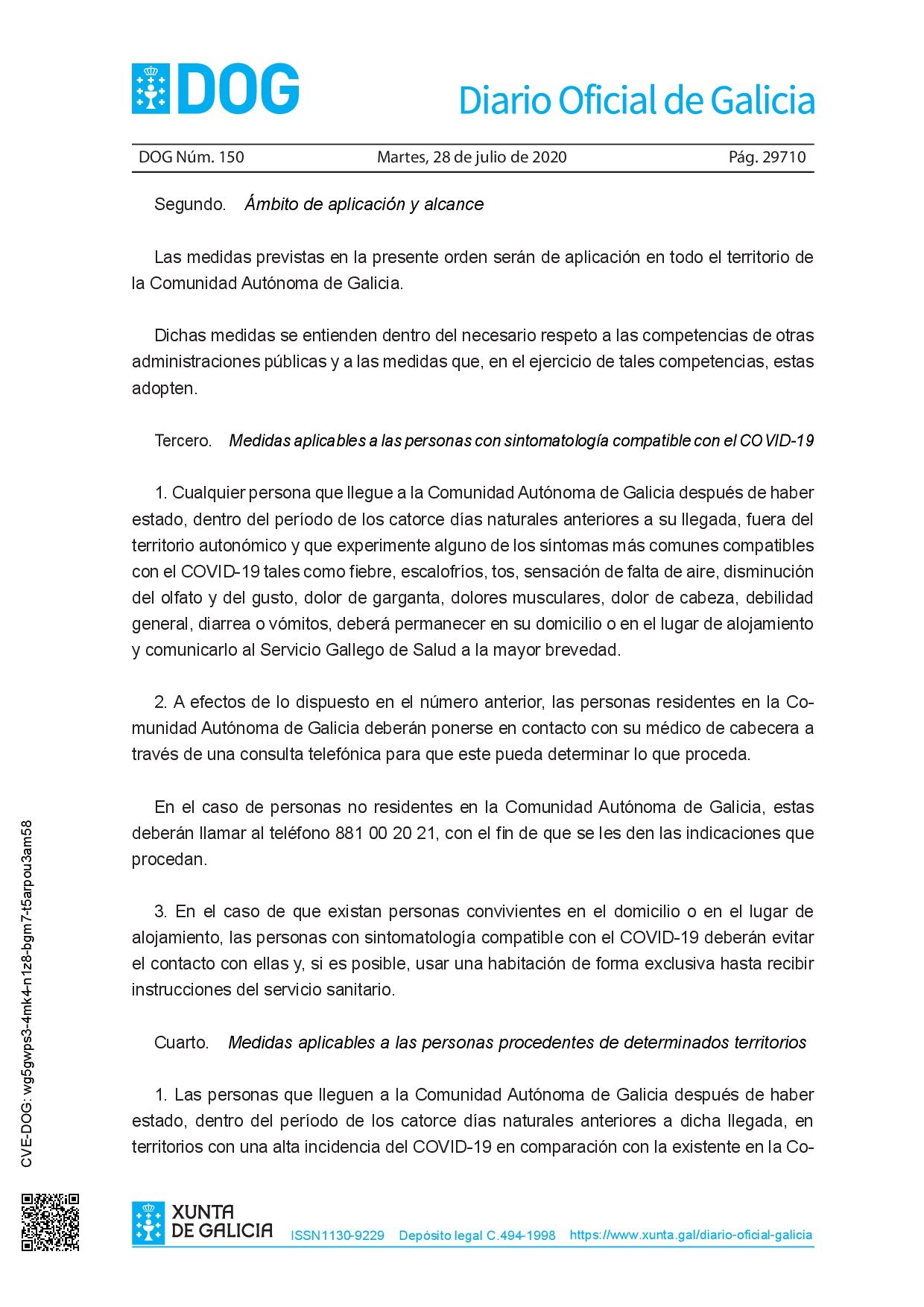 La Orden de 27 de julio de 2020 (https://www.xunta.gal/dog/Publicados/2020/20200728/AnuncioC3K1-270720-1_es.pdf) establece medidas de prevención para hacer frente a la crisis sanitaria por COVID-19 en relación con la llegada a la Comunidad Autónoma de Galicia de personas de otros territorios.